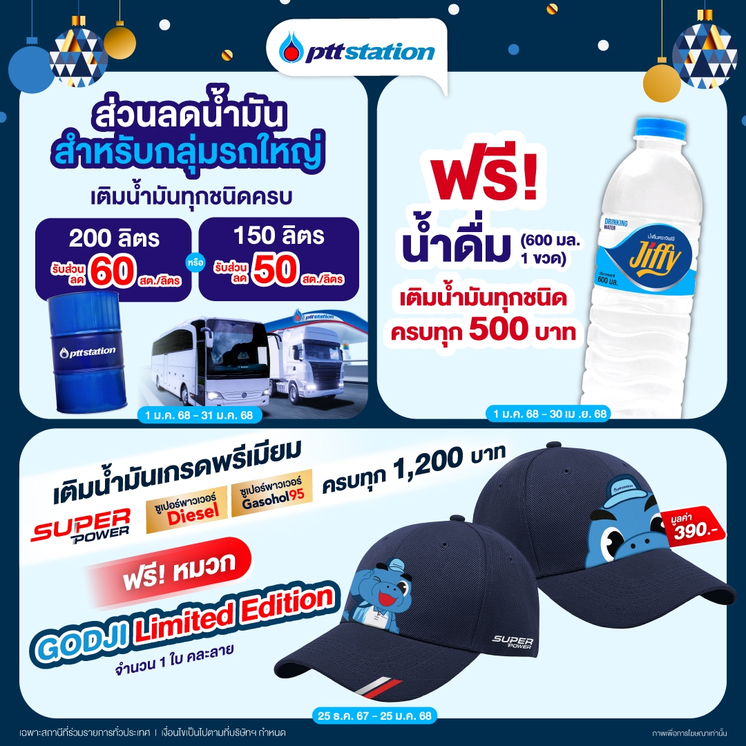 สถานีบริการ PTT Station จัดโปรโมชันพิเศษ เมื่อเติมน้ำมันทุกชนิดครบ 500 บาท รับฟรี น้ำดื่ม 1 ขวด ตั้งแต่วันที่ 1 มกราคม-30 เมษายน 2568 และพิเศษสำหรับลูกค้าที่เติมน้ำมัน Super Power ครบ 1,200 บาท รับฟรี หมวก GODJI Limited Edition 1 ใบ ตั้งแต่วันที่ 25 ธันวาคม 2567-25 มกราคม 2568 รวมทั้ง เมื่อเติมน้ำมันทุกชนิดครบ 100 บาทขึ้นไป รับฟรี ประกันอุบัติเหตุคุ้มครองสูงสุด 100,000 บาท ตั้งแต่วันที่ 25 ธันวาคม 2567-3 มกราคม 2568 นอกจากนี้ สำหรับกลุ่มรถใหญ่ เมื่อเติมน้ำมันทุกชนิดครบ 150 ลิตร รับส่วนลด 0.50 บาท/ลิตร หรือเมื่อเติมครบ 200 ลิตร รับส่วนลด 0.60 บาท/ลิตร ตั้งแต่วันที่ 1-31 มกราคม 2568