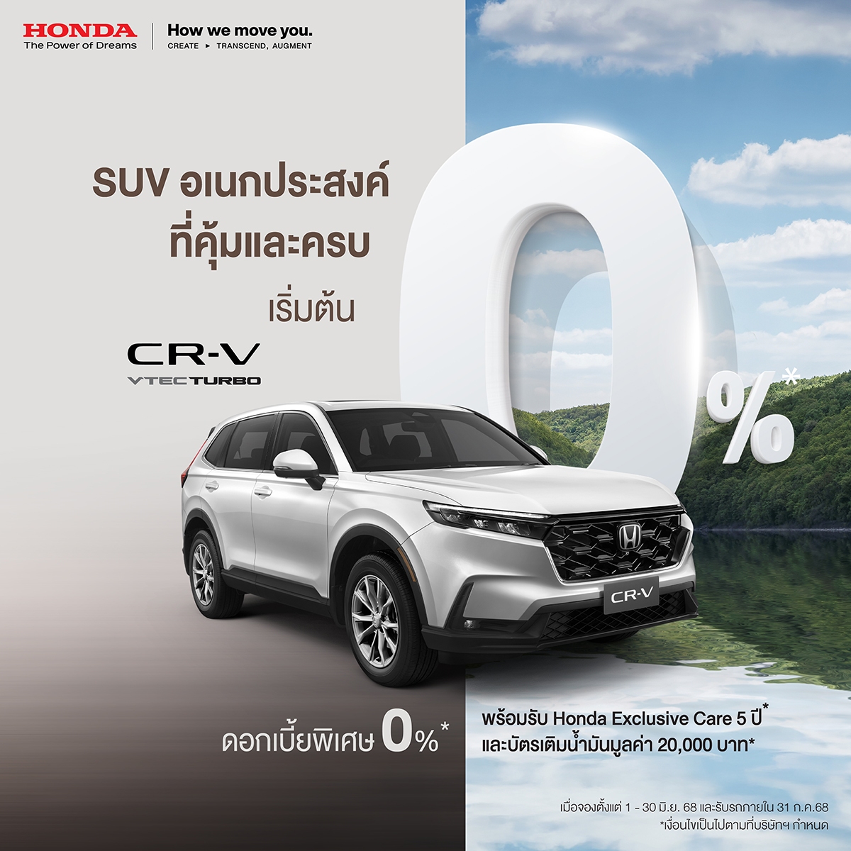 Honda CR-V Turbo รถ SUV ครอบครัวที่คุ้มและครบ ราคาเริ่มต้น 1,419,000 บาท รับข้อเสนอดอกเบี้ย 0% พร้อมรับ Honda Exclusive Care 5 ปี และรับเพิ่มบัตรเติมน้ำมันมูลค่า 20,000 บาท หรือเลือกผ่อนเบา ๆ รับHondaช่วยผ่อนเดือนละ 8,300 บาท จำนวน 12 เดือน รวมมูลค่า 99,600 บาท จ่ายค่างวดเริ่มต้นเพียง 6,423 บาท [คำนวณจาก Honda CR-V เกรด E เงื่อนไขดาวน์ 20% ผ่อน 7 ปี ซึ่งเป็นค่างวดที่หักจากสิทธิพิเศษ Honda ช่วยผ่อนแล้ว] หรือเลือกดาวน์ต่ำเพียง 10%