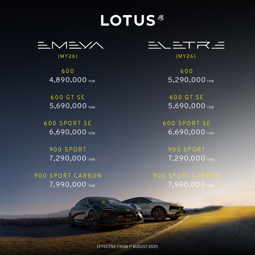 จากความตั้งใจของ Lotus Car ประเทศไทย มุ่งหวังที่จะมอบพลังแห่งการขับขี่ที่เข้าถึงทุกคน ซึ่งทาง Lotus Carได้สร้างมาตรฐานใหม่ (MY26) ให้กับทุกรุ่นย่อย โดยมีรุ่นเริ่มต้น คือ Emeya 600 และ Eletre 600 ซึ่งในแต่ละรุ่นย่อยจะนำเสนอความโดดเด่นที่มีความแตกต่างด้านออพชัน ระดับความเอกซ์คลูซีฟ ความสะดวกสบายที่ตอบโจทย์ไลฟ์สไตล์ และความสปอร์ทที่ส่งเสริมสมรรถนะการขับขี่ให้สมบูรณ์แบบยิ่งขึ้น พร้อมมอบแคมเปญสุดเอกซ์คลูซีฟในการเปิดตัวราคาใหม่ในครั้งนี้ ให้แก่ลูกค้ากลุ่มแรกที่ทำการจองภายใน 31 สิงหาคม 2568 นี้เท่านั้น*