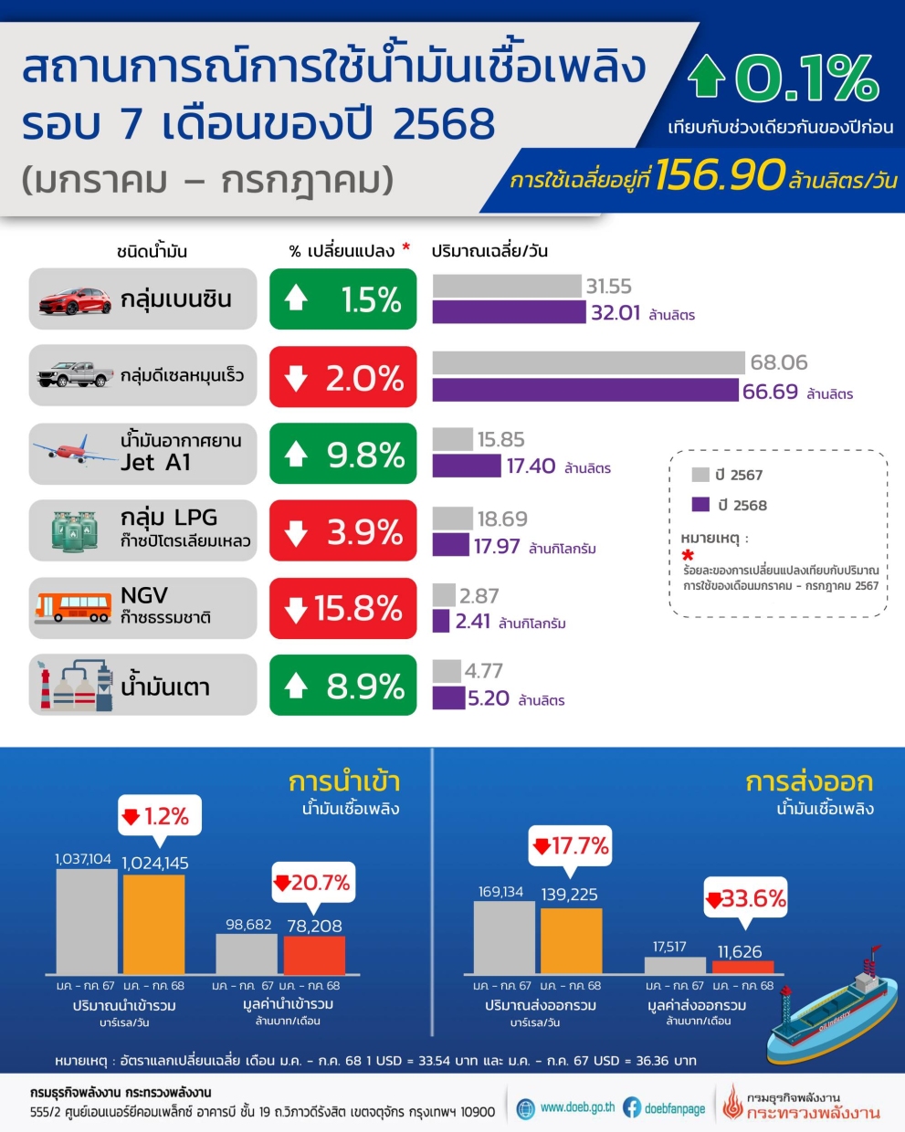 สราวุธ แก้วตาทิพย์ อธิบดีกรมธุรกิจพลังงาน เผยภาพรวมการใช้น้ำมันเชื้อเพลิง เดือนมกราคม-กรกฎาคม 2568 อยู่ที่ 156.90 ล้านลิตร/วัน เพิ่มขึ้นร้อยละ 0.1 เมื่อเทียบกับช่วงเดียวกันของปีก่อน โดยที่น้ำมันอากาศยานเชิงพาณิชย์ (Jet A1) เพิ่มขึ้นร้อยละ 9.8 การใช้น้ำมันเตาเพิ่มขึ้นร้อยละ 8.9 และกลุ่มเบนซินเพิ่มขึ้นร้อยละ 1.5 ขณะที่การใช้ LPG ลดลงร้อยละ 3.9 น้ำมันดีเซลหมุนเร็วลดลงร้อยละ 2.0 และ NGV ลดลงร้อยละ 15.8