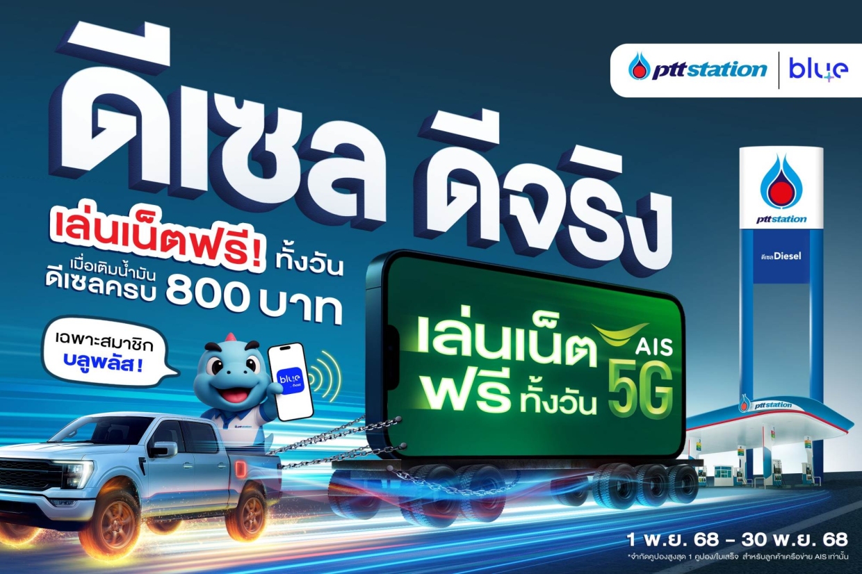 PTT Station เดินหน้าตอกย้ำความเป็นผู้นำตลาดน้ำมันดีเซล ด้วยแคมเปญสุดแรง “ดีเซล ดีจริง” มอบความคุ้มค่า 2 ต่อให้ผู้ใช้รถดีเซลทั่วประเทศ สำหรับสมาชิก Blue+ เติมน้ำมันดีเซลเกรดมาตรฐาน Xtra Save ครบ 800 บาท/ใบเสร็จ รับฟรีทันที คูปองอินเตอร์เนท AIS 1 GB 1 วัน มูลค่า 35 บาท (ไม่รวมภาษีมูลค่าเพิ่ม) ใช้ได้ทั้งระบบเติมเงิน และรายเดือน ตั้งแต่วันที่ 1-30 พฤศจิกายน 2568 ที่สถานีบริการ PTT Station ที่ร่วมรายการทั่วประเทศ