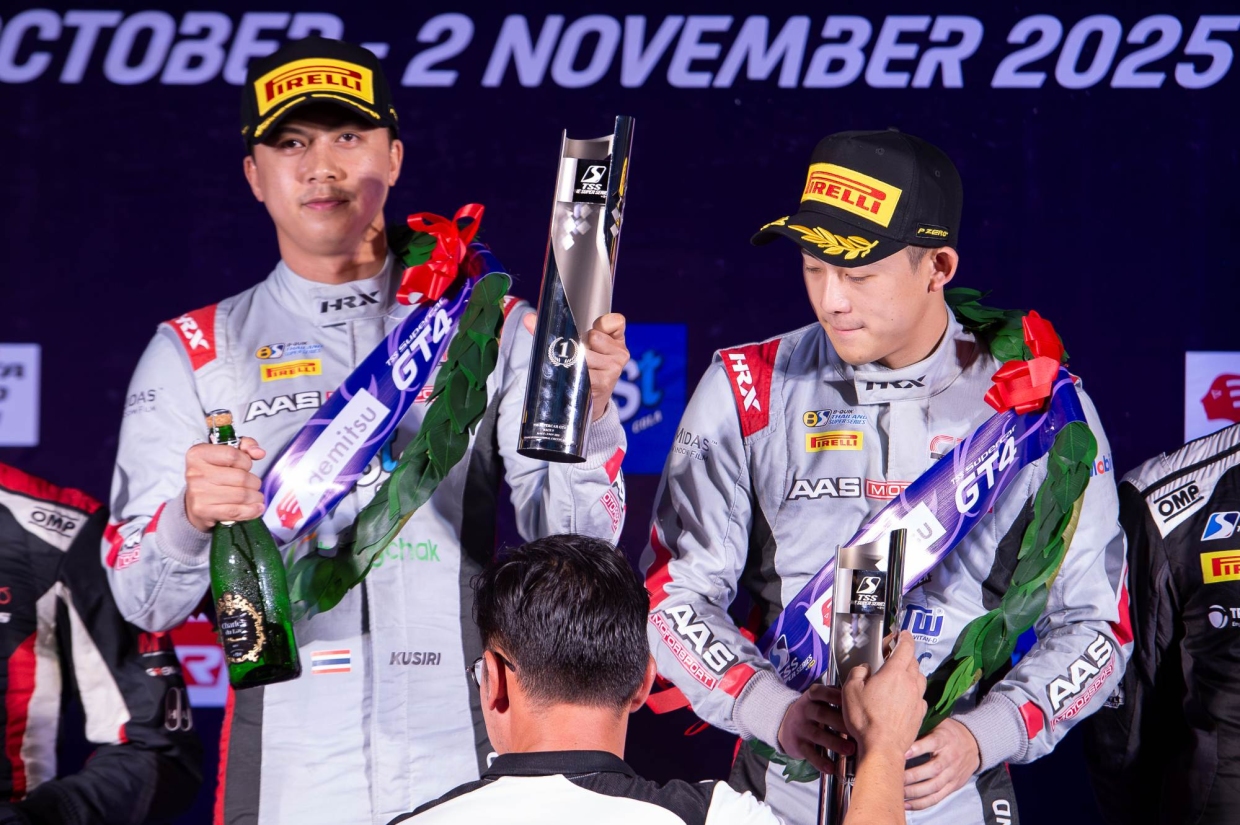 อีกหนึ่งคลาสส์ที่ดุเดือดไม่แพ้กัน คือ รุ่น Supercar GT4 ของทีม AAS Motorsport ที่โชว์ฟอร์มร้อนแรงตลอดสุดสัปดาห์ เริ่มด้วยรถแข่งหมายเลข 1 ของคู่ทีมเมทฟอร์มดุ “บูม กันตธีร์” และ “มิกกี คมิก” ที่ทำผลงานโดดเด่นตั้งแต่รอบซ้อม ด้วยความเร็วต่อรอบที่กดเวลาได้เร็วที่สุด ส่งผลให้ในรอบ Qualifying “บูม กันตธีร์” จะได้ออกสตาร์ทจากตำแหน่ง Pole Position ส่วน “มิกกี คมิก” คว้ากริดที่ 2 มาครอง และเมื่อเกม Race 9 มาถึงทั้งคู่ขับเคี่ยวอย่างเฉียบขาด บุกบู๊เต็มพิกัด ซิ่งทะยานเข้าเส้นชัยเป็นอันดับ 1 (P1) ผงาดขึ้นเป็น The Winner ของรุ่น Supercar GT4 อย่างสมศักดิ์ศรี อย่างไรก็ตาม ความท้าทายที่ยิ่งใหญ่ยังรออยู่ใน Race 10 ซึ่งเป็นเรศชี้ชะตาตัดสินแชมพ์ประจำปี แม้จะเดินหน้ากดคันเร่งเต็มพลัง ไล่บี้คู่แข่งอย่างไม่ลดละ แต่ด้วยเวลาที่เหลือไม่เพียงพอ ทำให้จบการแข่งขันในอันดับที่ 5 (P5) แม้จะพลาดตำแหน่งแชมพ์ประจำปีไปอย่างน่าเสียดาย แต่ด้วยคะแนนสะสมที่สม่ำเสมอตลอดฤดูกาล ทั้งคู่ยังคงสร้างความภูมิใจให้แก่ทีม ด้วยการคว้าตำแหน่ง “รองแชมพ์ประจำปี 2025” รุ่น Supercar GT4 มาครองได้อย่างยอดเยี่ยม