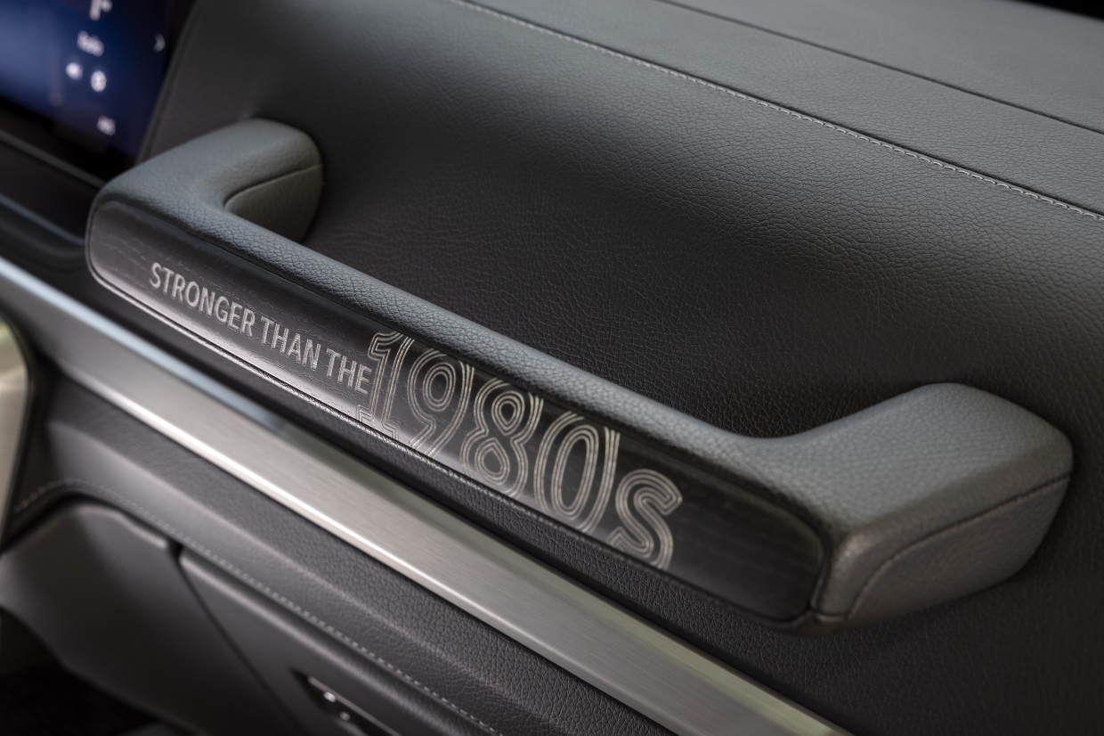 ภายในห้องโดยสารโดดเด่นด้วยเบาะหุ้มหนังสลับผ้าแบบ Leather/Fabric ที่มาในสี Dove Grey/Black และตราสัญลักษณ์ Edition Badge บริเวณเสา B-pillar ส่วนคอนโซลกลางประทับหมายเลข 1 of 460 สื่อถึงจำนวน 1 ใน 460 คันทั่วโลก (ทุกคันจะใช้ตราหมายเลขแบบนี้ ไม่ใช่การรันหมายเลขลำดับของตัวรถ) พร้อมตกแต่งห้องโดยสารด้วย Manufaktur trim ในไม้ Ash Wood แบบ black flamed open-pore มือจับคอนโซลหน้าสลักคำว่า Stronger Than The 1980s และกาบบันไดประตูคู่หน้ำตกแต่งด้วยแบบ Schöckl Manufaktur