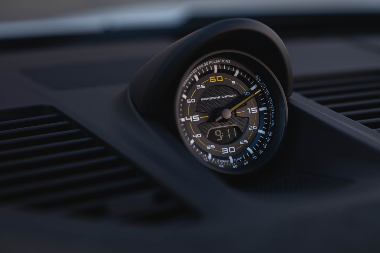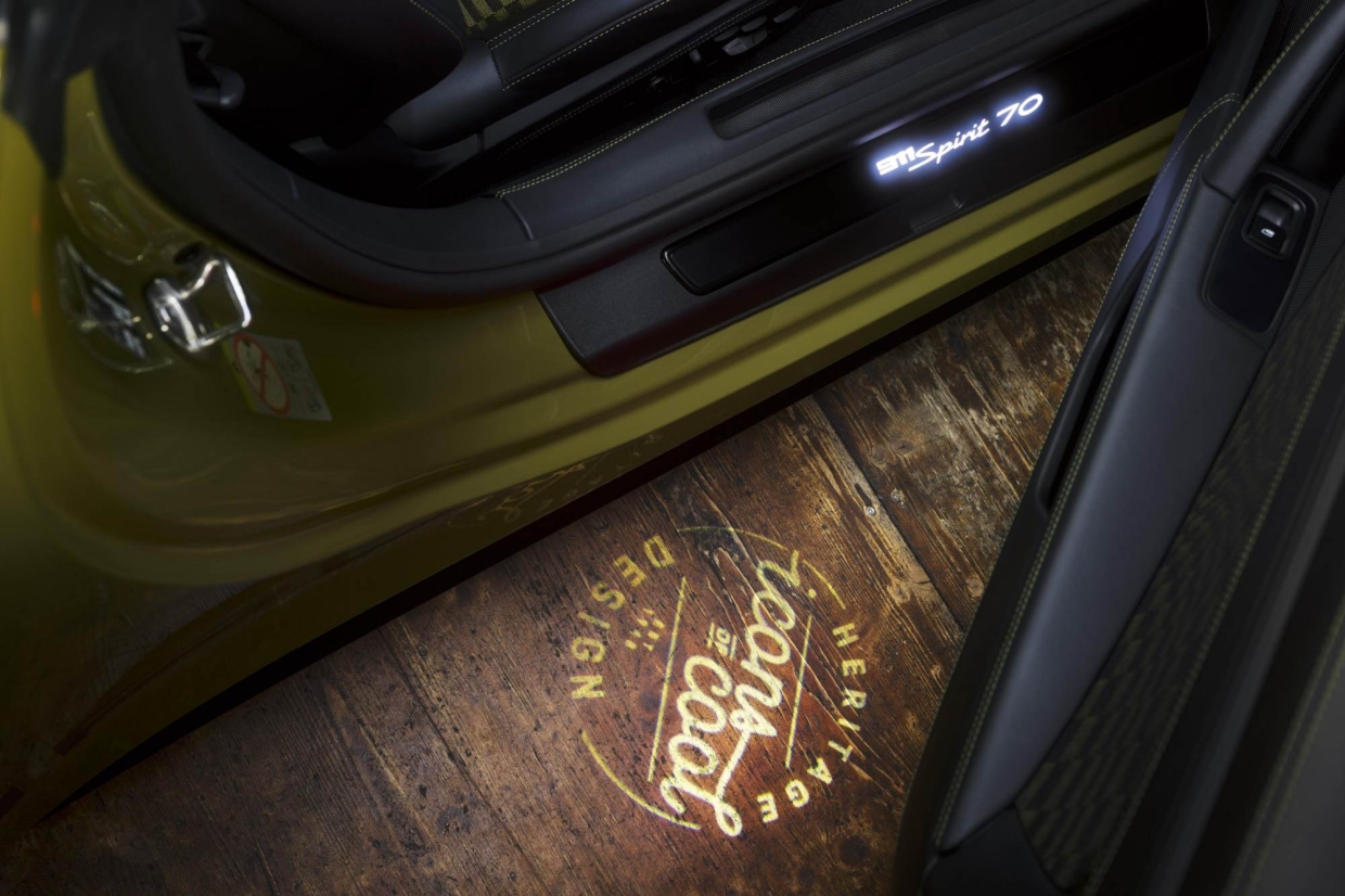 911 Spirit 70 มาพร้อมหลังคาผ้า และกรอบกระจกหน้าสีดำ ลายสามแถบสีดำแบบกึ่งด้านบนฝากระโปรงหน้า ที่ได้รับแรงบันดาลใจจากสติคเกอร์ความปลอดภัยในยุค 1970 และหลังคาผ้าสีตัดกับตัวถัง พร้อมตราสัญลักษณ์ Porsche ที่ใช้การออกแบบใกล้เคียงกับสัญลักษณ์ดั้งเดิมในปี 1963 เสริมความพิเศษด้วยตัวอักษรสีทอง พร้อมอักษร “Porsche Exclusive Manufaktur” บนซุ้มล้อหน้า