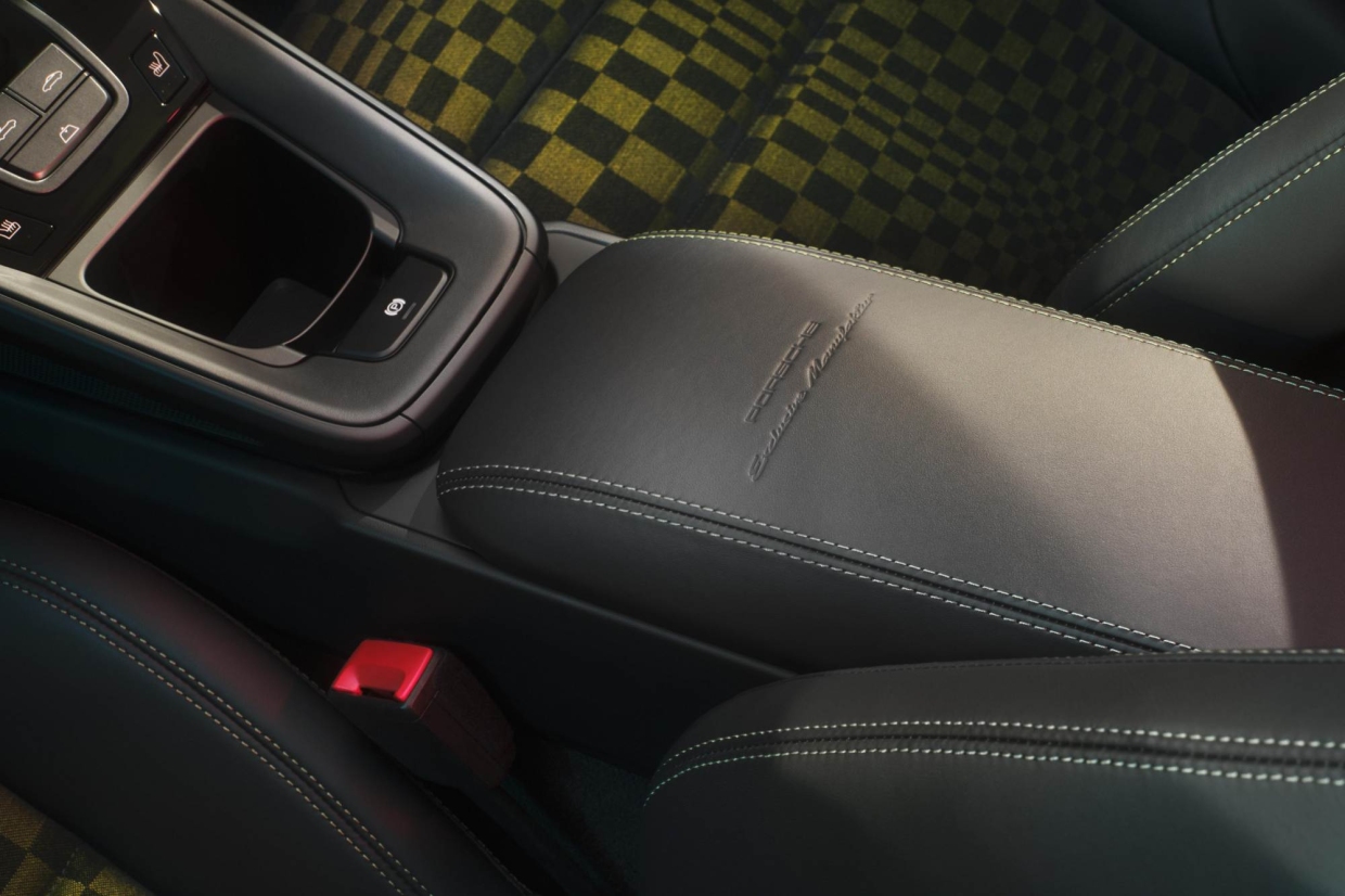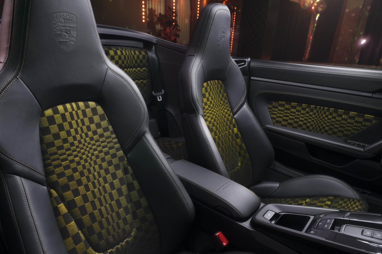 การตกแต่งภายในโดดเด่นด้วยลาย Pasha สีดำตัดกับสีเขียว ลายที่ได้รับแรงบันดาลใจจากธงตราหมากรุกที่กำลังโบกสะบัด ด้วยการจัดวางสี่เหลี่ยมหลายขนาดเพื่อสร้างมิติของการเคลื่อนไหว เพื่อให้ความรู้สึกถึงรถแข่งในยุค 70 และหนัง Club Leather สี Basalt Black พร้อมเดินตะเข็บด้ายสี Olive Neo รวมถึงแพคเกจตกแต่งภายใน Basalt Black Club Leather ที่เป็นมาตรฐาน