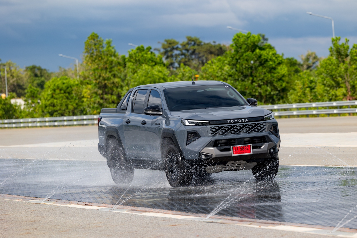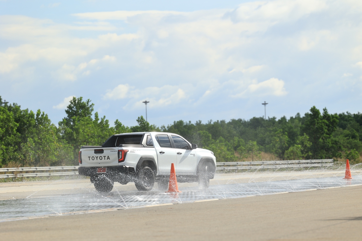 ขับผ่านแผ่นกระเบื้องฉีดน้ำ พื้นผิวลื่น ระบบควบคุมการทรงตัว (VSC) และระบบป้องกันล้อหมุนฟรี (TRC) ช่วยให้การควบคุมรถง่ายขึ้น แต่ก็ต้องความเร็วอย่างเหมาะสม