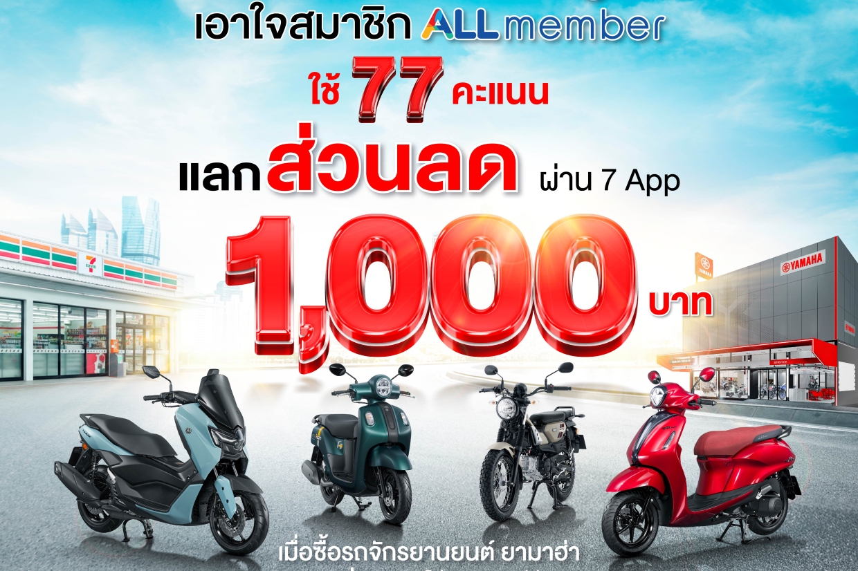 บริษัท ไทยยามาฮ่ามอเตอร์ จำกัด ยังคงเดินหน้าส่งมอบประสบการณ์ที่แตกต่าง และเต็มไปด้วยคุณค่าภายใต้แนวคิด “Feel the Unique Experience” ให้แก่ลูกค้าทั่วประเทศ โดยผนึกกำลังกับ All Member เปิดตัวสิทธิพิเศษสุดคุ้ม เพียงใช้คะแนน All Member เพียง 77 คะแนน แลกรับโคดส่วนลด 1,000 บาท ผ่านแอพพลิเคชัน 7-11 สำหรับใช้ซื้อรถจักรยานยนต์ Yamaha (ยามาฮา) ทุกรุ่น (ไม่เกิน 400 ซีซี) ที่ร้านผู้จำหน่าย Yamaha ทั่วประเทศ ตั้งแต่วันที่ 24 พฤศจิกายน 2568-3 มกราคม 2569 จำนวนจำกัดที่ 1,000 สิทธิ์