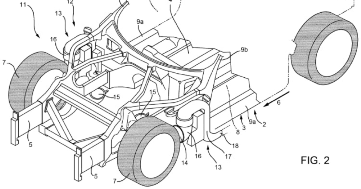 จากสิทธิบัตรเป็นรถเครื่องยนต์วางหน้าของ Ferrari ที่มีชุดท่อไอเสียออกจากทั้งสองฝั่งของเสื้อสูบแบบวี แล้วเดินท่ออ้อมไปด้านหลังของล้อหน้า แล้วยกขึ้น และงอลงตรงด้านข้างโครงสร้างรถ ก่อนเดินท่อออกไปด้านข้างตัวรถแล้วปล่อยออกก่อนถึงล้อหลัง จากภาพจะเห็นว่าตัวท่อไอเสียอยู่ในตำแหน่งที่สามารถที่ดูดซับแรงกระแทกจากการชนด้านหน้าได้ โดยทำหน้าที่เป็นโครงสร้างเสริมความแข็งแรง ระหว่างล้อหน้า และห้องโดยสารไปในตัว การออกแบบท่อไอเสียแบบนี้ จะช่วยให้รถมีน้ำหนักน้อยลง โดยสามารถลดโครงสร้างเสริมความแข็งแกร่งของตัวรถได้ ทั้งทำหน้าที่ดูดซับพลังงานจากการชนด้วย