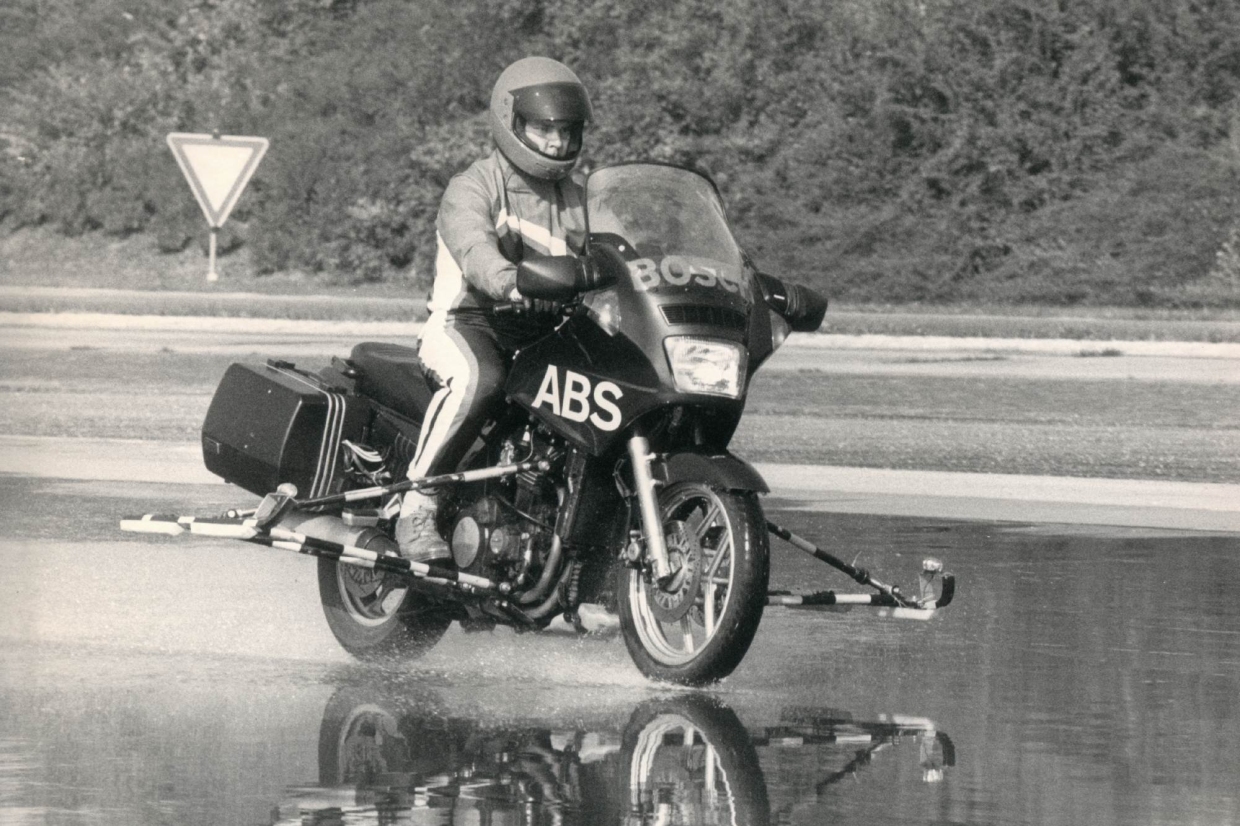 สืบเนื่องจากการผลิตเทคโนโลยี ABS สำหรับรถยนต์ในปี 1978 Bosch เริ่มพัฒนาต่อยอดระบบ ABS สำหรับรถจักรยานยนต์ในปี 1986 และได้ก่อตั้งศูนย์ความเชี่ยวชาญระดับโลกด้านความปลอดภัยรถจักรยานยนต์ในประเทศญี่ปุ่นเมื่อปี 2007 จากนั้นได้พัฒนาอย่างก้าวกระโดด เช่น ABS 9 แบบคอมแพคท์ในปี 2009, ABS 10 ที่มีน้ำหนักเบา สำหรับตลาดเกิดใหม่ในปี 2016 และแพคเกจ ABS 10 Enhanced ประสิทธิภาพสูงในปี 2018 การเปิดตัวระบบควบคุมเสถียรภาพรถจักรยานยนต์ (Motorcycle Stability Control-MSC) ในปี 2013 ยังตอกย้ำบทบาทของ Bosch ในด้านความปลอดภัยเชิงรุก ช่วยรองรับสถานการณ์ขับขี่ที่มีความเสี่ยง เช่น การเข้าโค้ง หรือการหลบหลีกอย่างรวดเร็ว