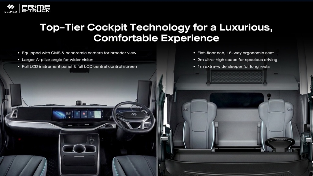 พัทธนัย วนาศรีสันต์ รองประธานกรรมการ ฝ่ายการตลาด บริษัท ไพร์ม อี ทรัค จำกัด เปิดเผยถึงจุดเด่นของ DeepWay Star 6x4 ว่า “เราเลือก DeepWay Star 6x4 เป็นรุ่นเรือธง สำหรับการเปิดตัวครั้งนี้ เนื่องจากเป็นรุ่นที่ถูกพัฒนาเพื่อตอบโจทย์งานขนส่งตู้คอนเทเนอร์ หรือสินค้าที่วิ่งระยะไกล โดยไม่ต้องเสียเวลาชาร์จบ่อยครั้งระหว่างขนส่ง โดยมีจุดเด่นสำคัญ ได้แก่