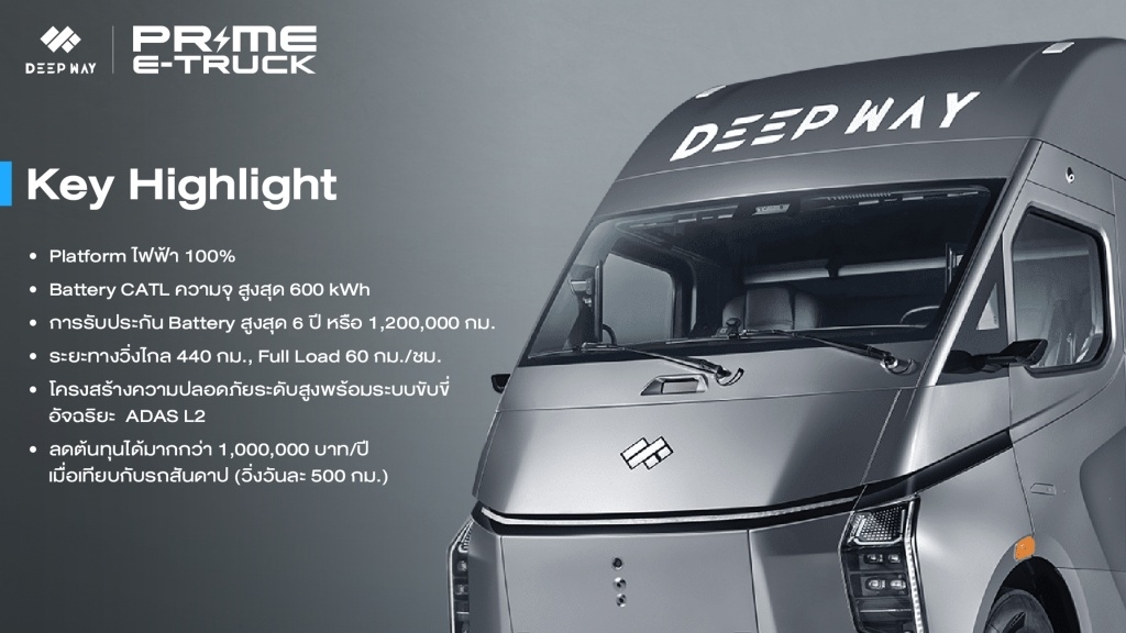 บริษัท ไพร์ม อี ทรัค จำกัด (Prime E Truck) ประกาศความร่วมมือเชิงกลยุทธ์กับ DeepWay ผู้พัฒนาเทคโนโลยีรถหัวลากไฟฟ้าแต่งตั้ง Prime E Truck เป็นผู้จัดจำหน่ายรถหัวลากไฟฟ้า DeepWay แต่เพียงผู้เดียวในประเทศไทย เปิดตัวรถหัวลากไฟฟ้ารุ่นเรือธง “DeepWay Star 6x4” (ดีพเวย์ สตาร์ 6x4) อย่างเป็นทางการในตลาดไทย พร้อมลงนามบันทึกความเข้าใจ (MOU) ร่วมผลักดันการเปลี่ยนผ่านลอจิสติคส์จากพลังงานดีเซลสู่ระบบพลังงานไฟฟ้า ความร่วมมือครั้งนี้ถือเป็นจุดเปลี่ยนสำคัญของอุตสาหกรรมขนส่งไทยสู่ยุค "ลอจิสติคส์สีเขียว"