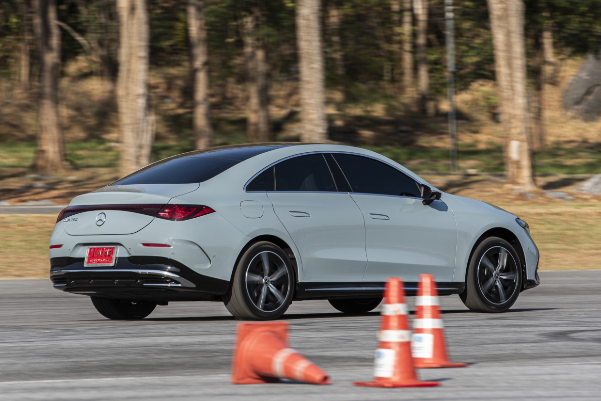อย่างที่เรากล่าวในหัวข้อตัวถังภายนอกไปแล้วว่า Mercedes-Benz CLA 250+ Electric มีน้ำหนักโดยรวมถึงระดับ 2 ตัน จากการติดตั้งแบทเตอรีขนาดใหญ่ แต่เรากลับพบว่าการตอบสนองขณะหักเลี้ยวมีความคล่องแคล่ว ฉับไวอย่างน่าทึ่ง การเลี้ยวต่อเนื่อง หรือเลี้ยวที่แคบ รวมถึงการเลี้ยว 2 ครั้งต่อเนื่องคล้ายสถานการณ์ฉุกเฉิน