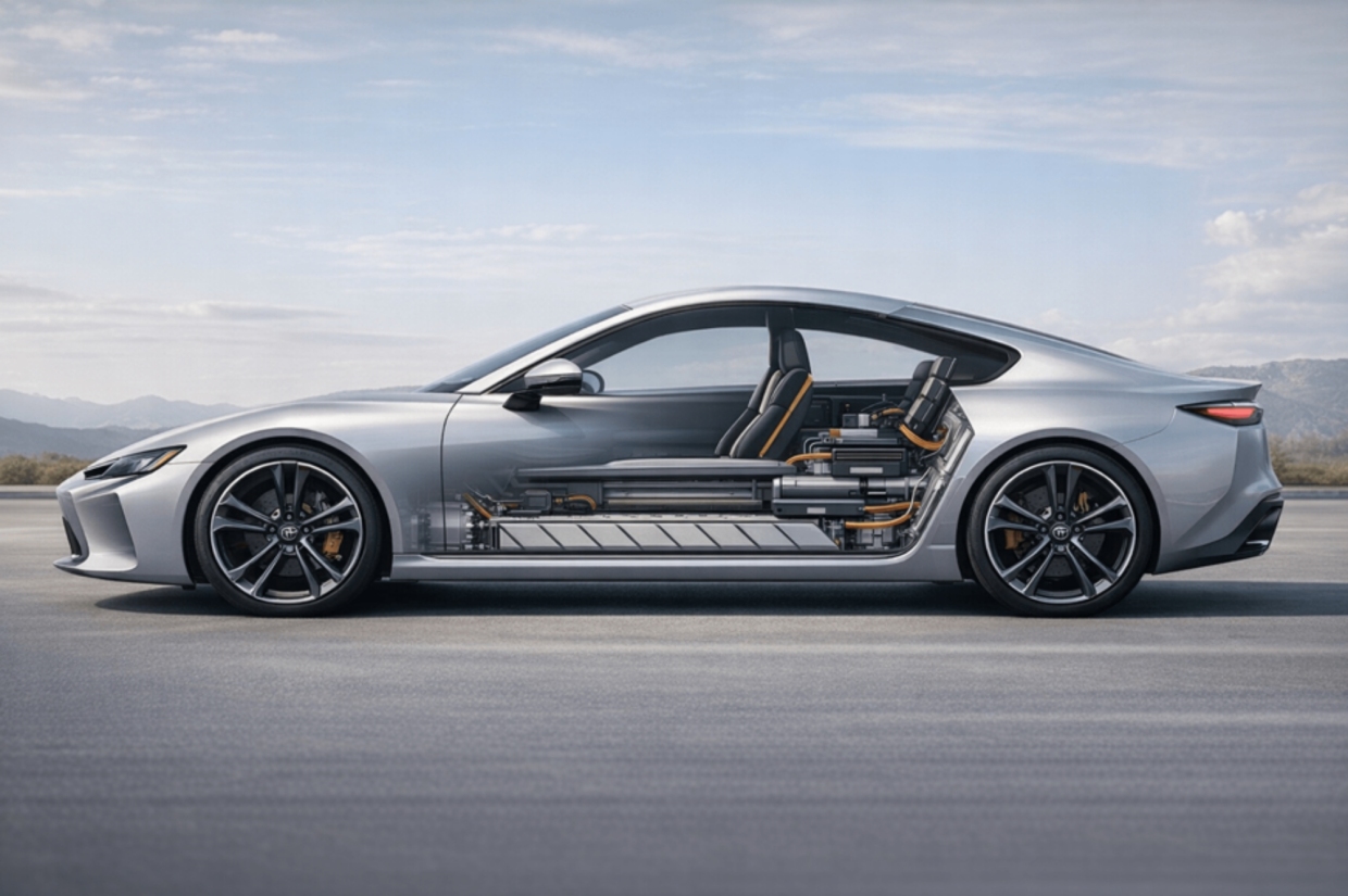 แทนการจัดวางอุปกรณ์ต่างๆ จนซ้อนกันเป็นชั้นหนา Toyota ใช้แนวคิดใหม่ โดยให้อุปกรณ์ซ้อนกัน แต่กระจายส่วนต่างๆ ออกไป แบทเตอรียังวางอยู่ใต้พื้นห้องโดยสาร แต่อุปกรณ์อีเลคทรอนิคส์ เช่น Power Control Unit และกล่องเชื่อมต่อสายไฟ ถูกกระจายไปยังตำแหน่งอื่น แทนการซ้อนกันอยู่ในที่เดียว จนทำให้พื้นห้องโดยสารบางลง โดยแบทเตอรีมีความหนาเท่าเดิม