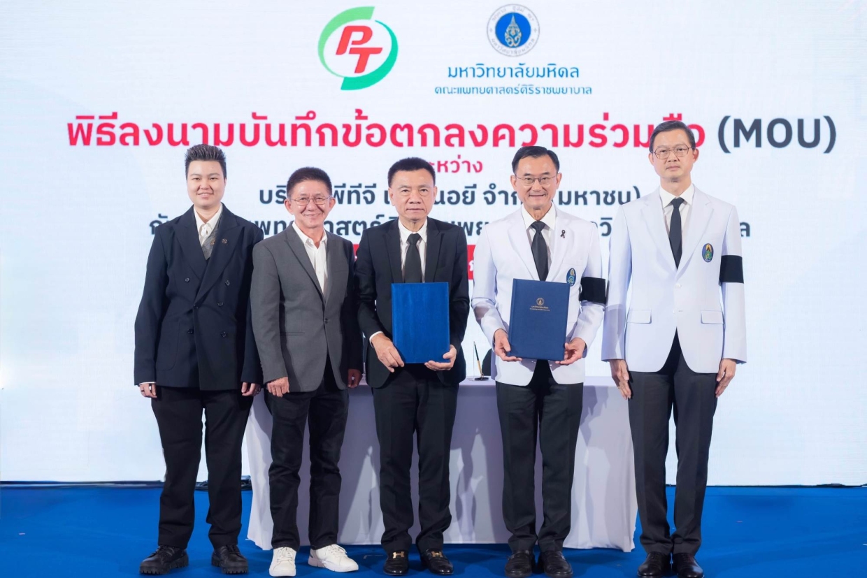 พิทักษ์ รัชกิจประการ ประธานเจ้าหน้าที่บริหารและกรรมการผู้จัดการใหญ่ บริษัท พีทีจี เอ็นเนอยี จำกัด (มหาชน) หรือ PTG ร่วมลงนามบันทึกข้อตกลงความร่วมมือ (MOU) กับ ศ.นพ.อภิชาติ อัศวมงคลกุล คณบดีคณะแพทยศาสตร์ศิริราชพยาบาล มหาวิทยาลัยมหิดล เพื่อยกระดับความร่วมมือระหว่างภาคการแพทย์ และสถานีบริการน้ำมัน PT โดยใช้สถานีบริการน้ำมัน PT ทั่วประเทศเป็นจุดจอดรถ Mobile Stroke Unit-Stroke One Stop (MSU-SOS) สนับสนุนการเข้าถึงผู้ป่วยฉุกเฉิน และรักษาได้อย่างรวดเร็ว เพิ่มโอกาสรอดชีวิตของผู้ป่วยโรคหลอดเลือดสมอง เพื่อให้คนไทยทุกคนได้ “อยู่ดี มีสุข” ตามวิสัยทัศน์ของ PTG อย่างแท้จริง