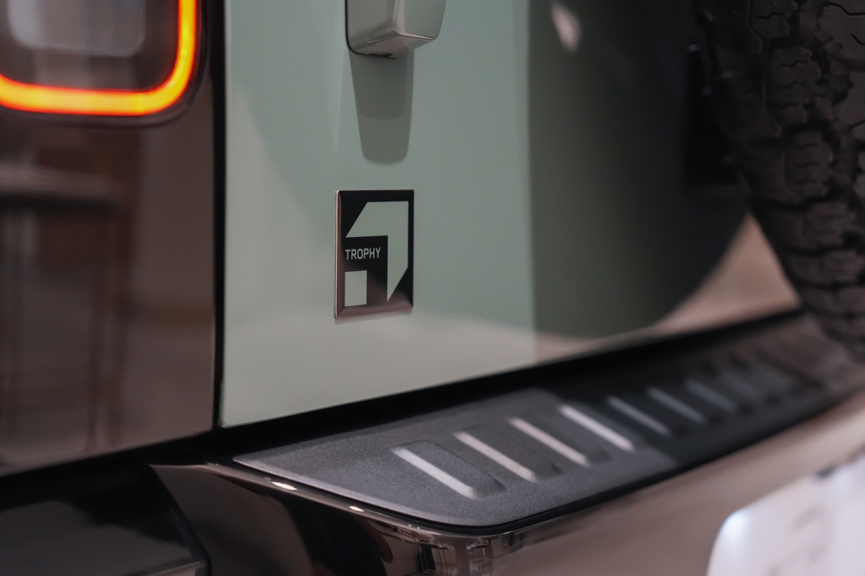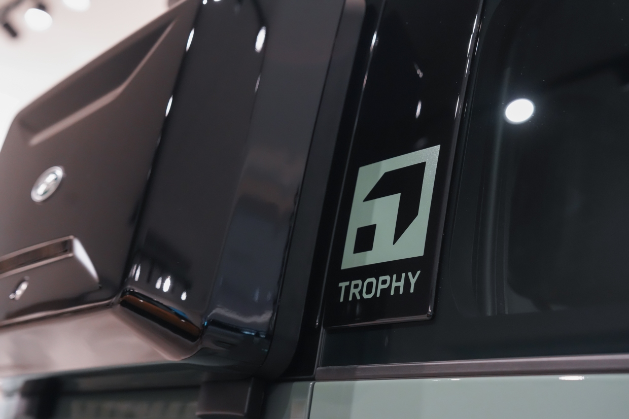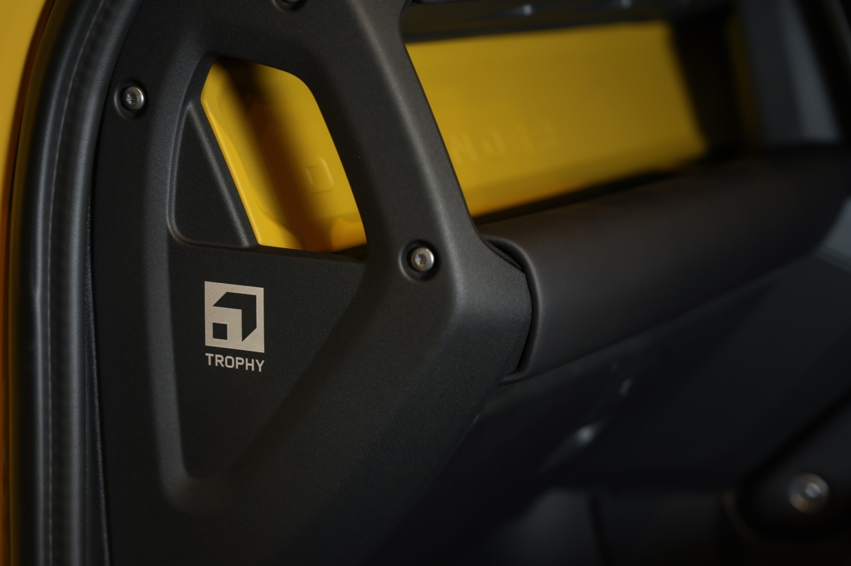 ตัวถังภายนอกตกแต่งด้วยสีดำเงา (Gloss Black) ในจุดสำคัญ อาทิ ฝากระโปรงหน้า ชายตัวถังด้านล่าง และคาลิเพอร์เบรค เพื่อเสริมภาพลักษณ์ที่ดุดัน และโดดเด่นยิ่งขึ้น รวมถึงห่วงลากด้านหลังสีดำเงา ซึ่งสะท้อนถึงสมรรถนะ และความพร้อมสำหรับการใช้งานในเส้นทางสมบุกสมบัน นอกจากนี้ ยังตกแต่งด้วยสติกเคอร์ดีคอล Trophy บนฝากระโปรงหน้า กราฟิกเสา C และตราสัญลักษณ์ Trophy บริเวณด้านหลัง ช่วยขับเน้นความเป็นรุ่นพิเศษได้อย่างชัดเจน เพื่อรองรับการขับขี่แบบออฟโรดที่ท้าทาย