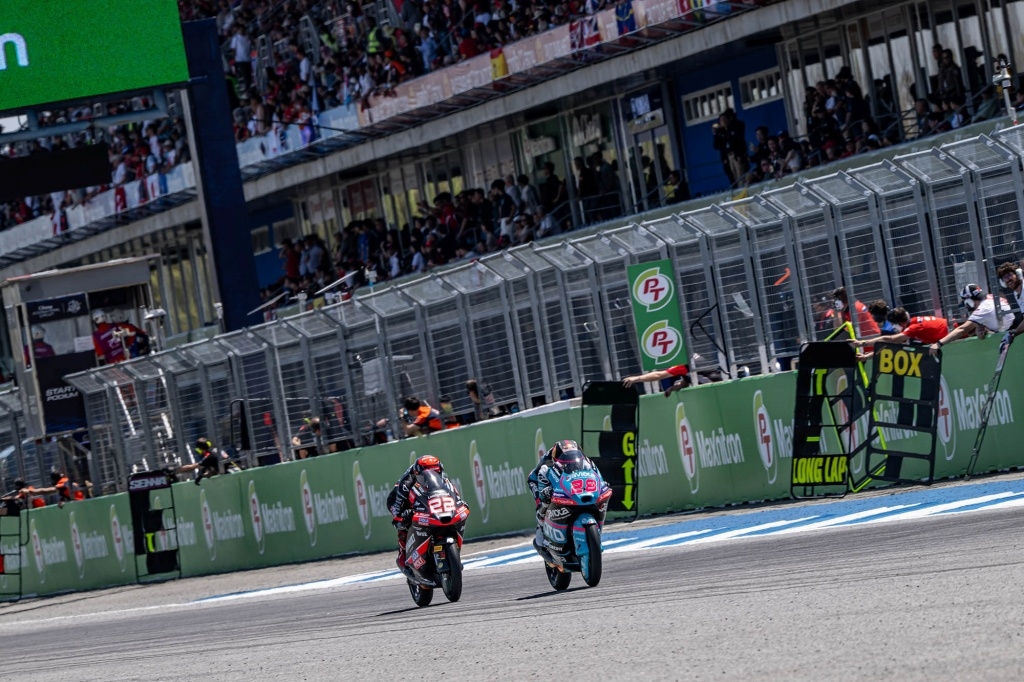 หลังจากนั้นกลายเป็น Pedro Acosta นักบิดสแปนิชจากทีม Redbull KTM Factory Racing ที่ขยับขึ้นมาไล่บี้กับ Marc Marquez อย่างหนัก และมีจังหวะที่พยายามแซงในโค้ง 12 ถึง 3 ครั้ง ก่อนจะแซงได้สำเร็จในช่วง 3 รอบสุดท้าย
