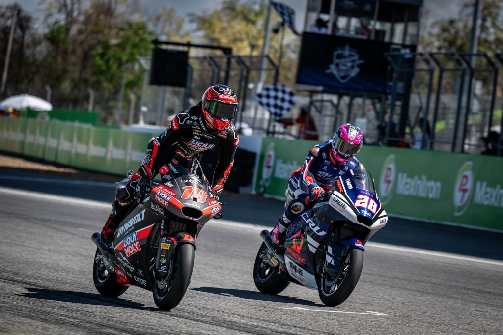 ถัดมาเป็นรุ่นใหญ่ MotoGP แข่งขัน 26 รอบสนาม ปรากกว่า Marco Bezzecchi ทีม Aprillia ทำผลงานได้ดีเกินคาด แก้เกมได้ดี บิดม้วนเดียวจบ คว้าแชมพ์ไปครองด้วยเวลารวม 39.36.270 นาที สนามนี้ร้อนแรงจริงๆ ส่วนตำแหน่งรองแชมพ์เป็นของ Pedro Acosta ทีม KTM ที่คว้าแชมพ์ Sprint Race ไปก่อนหน้านี้ และอันดับ 3 Raul Fernandez ทีม TrackHouse ส่วน Marc Marquez พลาดตำแหน่งไปแบบสุดช้ำ เพราะยางแตก ต้องออกจากการแข่งขัน
