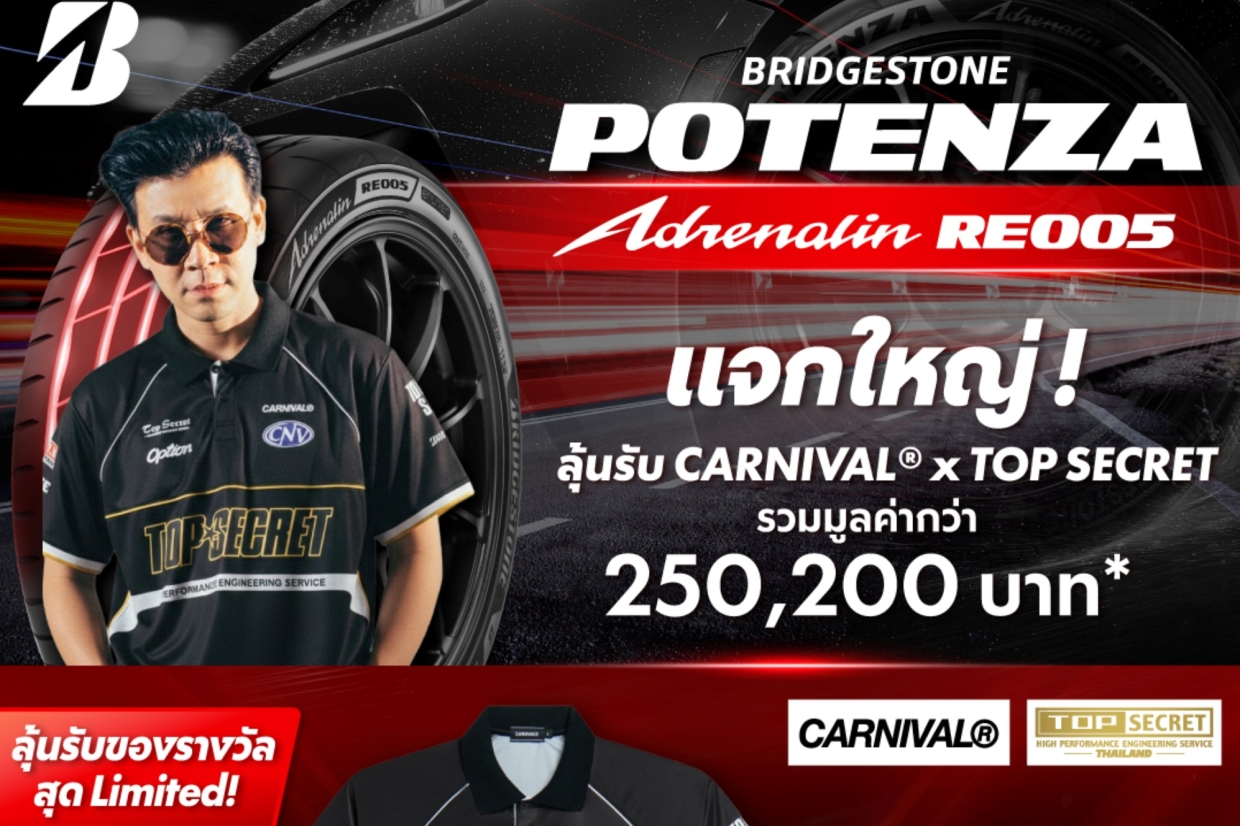 บริษัท บริดจสโตนเซลส์ (ประเทศไทย) จำกัด จัดโปรโมชันแรง แจกใหญ่เต็มสปีด ! ชวนสายสปอร์ทอัพเกรดความเร้าใจ เพียงซื้อยาง “Bridgestone Potenza Adrenalin RE005” ขอบใหญ่ ขนาด 17 นิ้วขึ้นไป ครบ 4 เส้น (ต่อ 1 ใบเสร็จ) ตั้งแต่วันที่ 10 มีนาคม 2569-30 เมษายน 2569 ที่ Cockpit สาขาที่ร่วมรายการทั่วประเทศ รับสิทธิ์ลุ้นของรางวัลสุดว้าว คอลเลคชันลิมิเทดจาก Carnival x Top Secret รวม 180 รางวัล มูลค่ารวมกว่า 250,200 บาท