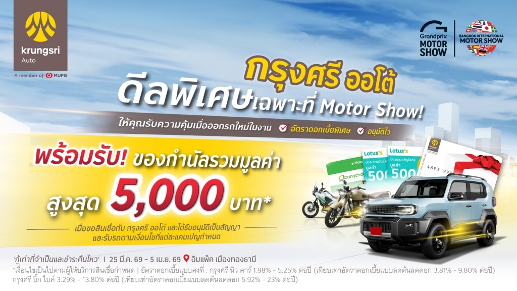 • สินเชื่อรถใหม่ “กรุงศรี นิว คาร์” อัตราดอกเบี้ยเริ่มต้น 1.98 % พร้อมลุ้นรับของกำนัลมูลค่าสูงสุด 5,000 บาทต่อสัญญา ประกอบด้วย Krungsri Gift Card มูลค่า 1,000 บาท สำหรับลูกค้าที่ได้รับอนุมัติและรับรถภายในวันที่ 30 มิถุนายน 2569 รับสิทธิ์ลุ้นรางวัลจากกิจกรรมภายในบูธ มูลค่าสูงสุด 3,000 บาท และรับเพิ่ม Lotus’s E-Coupons มูลค่าสูงสุด 1,000 บาท สำหรับรถยนต์ไฟฟ้าและไฮบริด เมื่อชำระค่างวด 3 งวดแรก ผ่าน Krungsri Auto Direct Debit