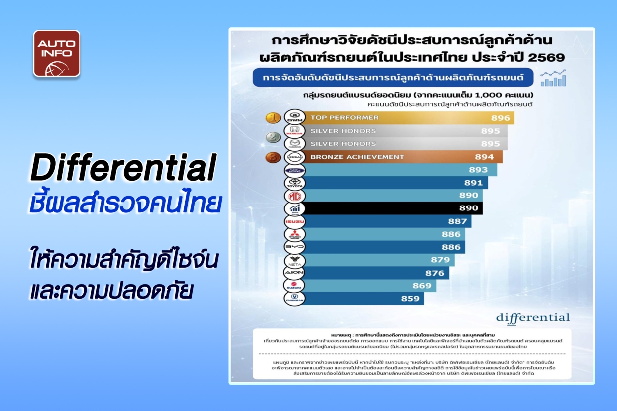 ศิรส สาตราภัย กรรมการผู้จัดการบริษัท ดิฟเฟอเรนเชียล ประจำประเทศไทย เปิดเผยว่า ผลการศึกษาวิจัย “ประสบการณ์ลูกค้าด้านผลิตภัณฑ์รถยนต์ในประเทศไทย” หรือ “Product Customer Experience Index (Product CXI) Study℠” ในครั้งนี้เราพบว่า เจ้าของรถในกลุ่ม GWM มีความพึงพอใจเฉลี่ยสูงสุด และครองอันดับ 1 ด้วยคะแนน 896 คะแนนจากคะแนนเต็ม 1,000 คะแนน รองลงมา คือ Honda และ Mazda (ได้ 895 คะแนนเท่ากัน) Nissan (ได้ 894 คะแนน) Ford (ได้ 893 คะแนน) และ Toyota (ได้ 891 คะแนน) โดยทุกยี่ห้อที่กล่าวมา มีคะแนนสูงกว่าค่าเฉลี่ยของอุตสาหกรรมซึ่งอยู่ที่ 890 คะแนน ขณะที่ MG ได้ 890 คะแนนซึ่งอยู่ที่ระดับค่าเฉลี่ย ส่วนแบรนด์อื่นๆ ได้คะแนนต่ำกว่าค่าเฉลี่ยของอุตสาหกรรม