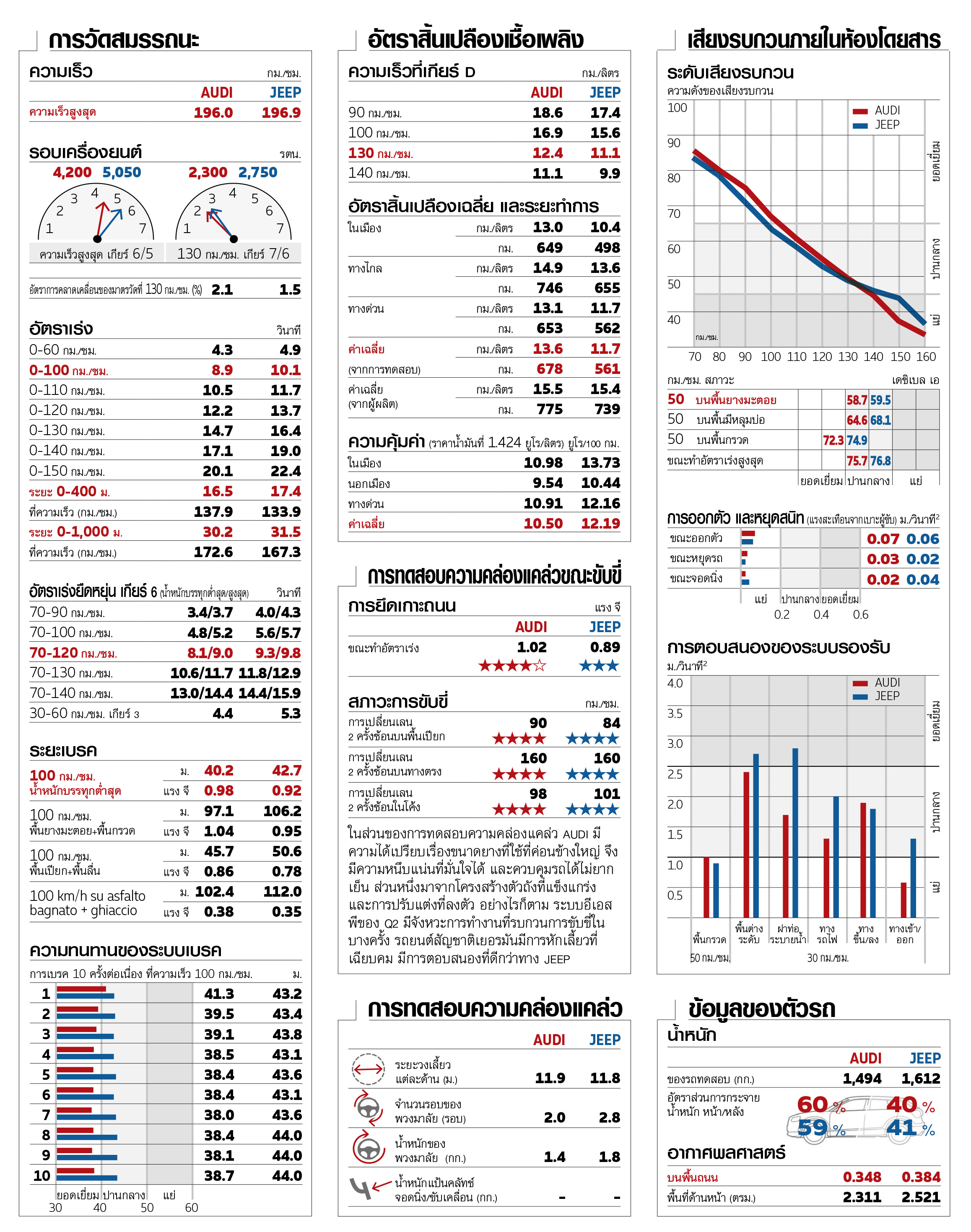 แม้จะมีความแตกต่างในรายละเอียด แต่เครื่องยนต์ทั้ง 2 บลอคก็มีประสิทธิภาพใกล้เคียงกัน เครื่องยนต์ 4 สูบเรียงของ JEEP มีช่วงความเร็วตีนปลายที่ไหลลื่น แต่ช่วงความเร็วต่ำตอบสนองช้าเล็กน้อย ส่วน AUDI มีสมรรถนะที่ทันใจดี