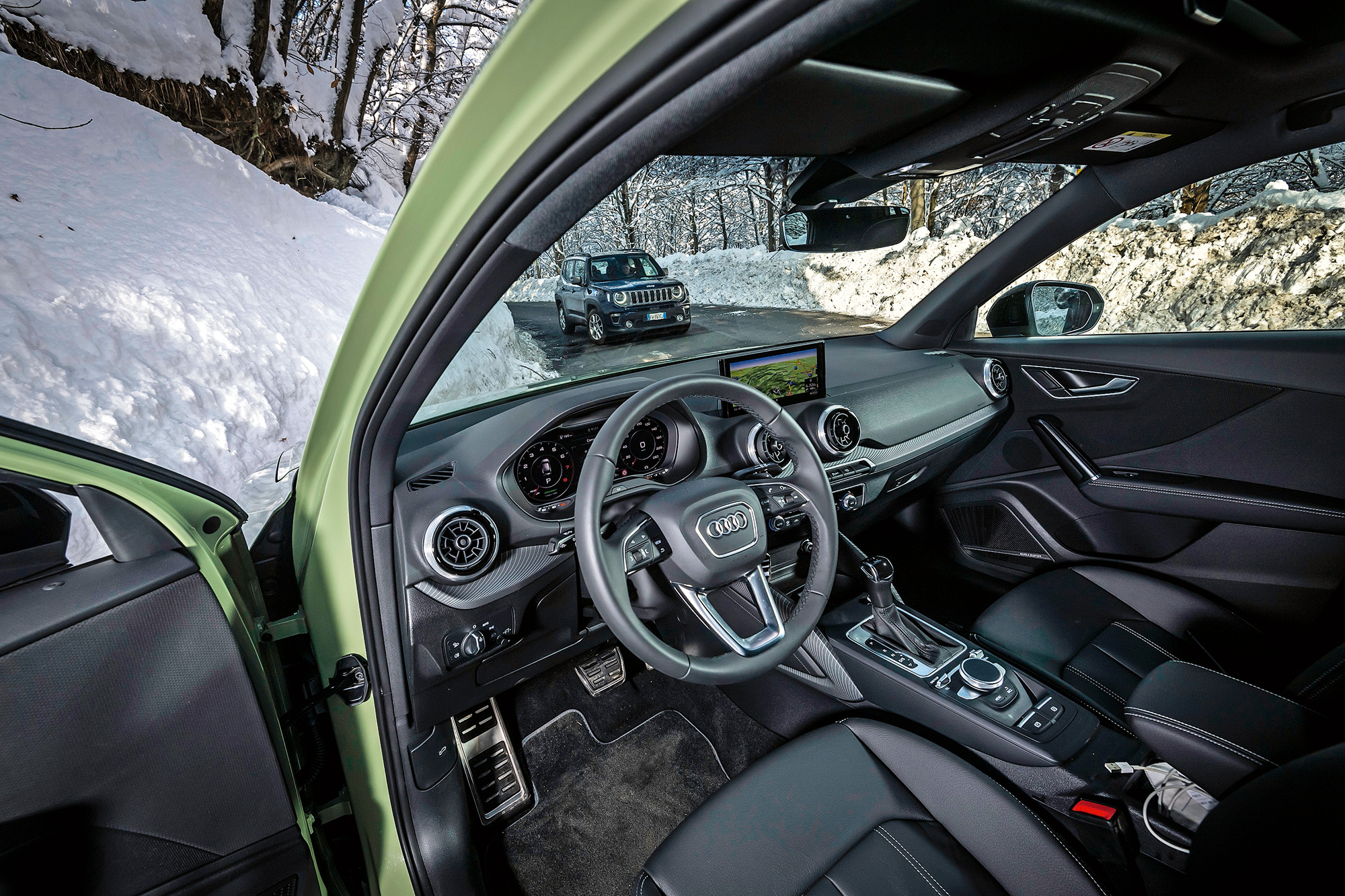 ความแตกต่างเห็นได้ชัดตั้งแต่อุปกรณ์ที่ติดตั้งมาให้ในรถแต่ละรุ่น ทาง JEEP สั่งงานผ่านจอระบบสัมผัส ขณะที่ AUDI ใช้งานผ่านปุ่มต่างๆ และยังมีระบบเนวิเกเตอร์ในตัว (ราคา 1,150 ยูโร) รองรับการเชื่อมต่อที่หลากหลาย ตั้งแต่ข่าวสารต่างๆ พยากรณ์อากาศ ตำแหน่งของศูนย์บริการ รวมถึงตำแหน่งของปั๊มน้ำมันที่อยู่ใกล้ๆ ส่วนทาง RENEGADE มีการแสดงผลบนหน้าจอที่ไม่ซับซ้อนเกินไป (ระบบเนวิเกเตอร์ต้องจ่ายเงินเพิ่มอีก 1,300 ยูโร) รองรับแอพพลิเคชันบางรายการ สามารถคำนวณอัตราสิ้นเปลืองเชื้อเพลิง และประเมินลักษณะการขับขี่ได้ด้วย