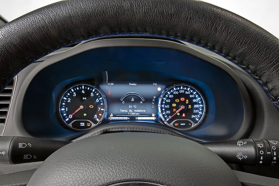ทางฝั่งรถยนต์ร่วมสัญชาติอิตาเลียน-อเมริกัน มีหน้าปัดที่ดูสวยงาม แสดงผลชัดเจน แต่รูปแบบแอนาลอกก็ยากที่จะสู้ความทันสมัยของหน้าปัดแบบดิจิทอลเต็มตัวขนาด 12.3 นิ้ว (เปลี่ยนโหมดได้) ของค่ายรถเยอรมัน