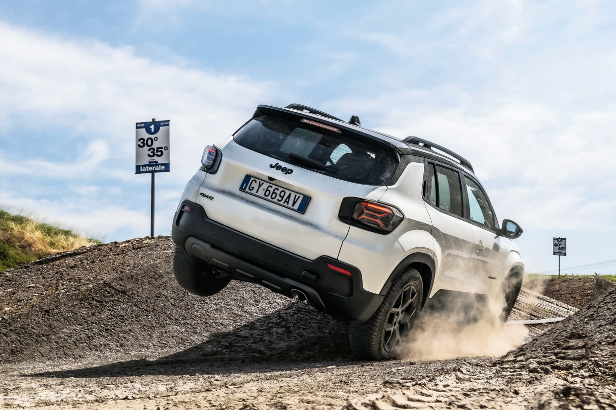 สิ่งที่เราพบจากการทดสอบรถรุ่นนี้ คือ ความทะเยอทะยานด้านการลุยที่อาจจะไม่เทียบเท่ารถร่วมค่ายอย่าง WRANGLER ส่วนหนึ่งเพราะไม่มีเทคโนโลยีเฉพาะทางอย่างระบบเกียร์ต่ำเน้นแรงบิด ระบบลอคการส่งกำลังชุดเพลาขับหรือช่วงการทำงานของระบบรองรับที่มีระยะยืด/ยุบค่อนข้างมาก แต่ AVENGER ยังสามารถทำให้ผู้ขับก้าวข้ามจากสู่การเป็นเพียงเอสยูวีที่ลุยได้ค่อนข้างจริงจัง ด้วยการปรับแต่งงค์ประกอบหลายอย่างที่ถูกออกแบบมาเพื่อเป้าหมายนี้โดยตรง อย่างไรก็ตาม ส่วนทดสอบแบบสมบุกสมบันของสนาม VAIRANO สามารถพิสูจน์ได้อย่างชัดเจน และได้เผยให้เห็นข้อจำกัดบางประการ โดยเฉพาะหนุ่งในประเด็นหลักของรถยนต์รุ่นนี้ นั่นคือ ระบบ ขับเคลื่อน 4 ล้อ ในสถานการณ์ที่ท้าทาย เช่น การบิดตัวของโครงสร้างเมื่อมีล้อสัมผัสพื้นเพียง 2 ล้อขณะที่อยู่ในตำแหน่งตรงข้ามกัน การทำงานร่วมกันระหว่าง เครื่องยนต์สันดาปที่ขับเคลื่อนล้อหน้า กับ มอเตอร์ไฟฟ้าที่ขับล้อหลังยังไม่ค่อยราบรื่นนัก เพลาส่งกำลังของล้อคู่หน้า-หลังดูผสานการส่งกำลังได้ไม่เต็มที่ ทำให้บางครั้งเกิดอาการ ล้อหน้าหมุนฟรี ก่อนจะตามมาด้วยแรงกระชากแบบกะทันหันจากด้านหลัง ส่งผลให้การควบคุมไม่ต่อเนื่องเท่าที่ควร อย่างไรก็ตาม ม่ควรคาดหวังความไหลลื่นแบบระบบขับเคลื่อน 4 ล้อตลอดเวลาที่เชื่อมโยงเพลาหน้า-หลังเข้าด้วยกันโดยตรง เพราะโดยรวมแล้ว สำหรับรถ B-SUV ที่เน้นใช้งานในเมือง อย่าง AVENGER ถือว่าทำผลงานได้ดีพอสมควร ทั้งการยึดเกาะจากยางที่ยอดเยี่ยม ระยะความสูงจากพื้นเพิ่มขึ้น (+10 มม. รวมเป็น 210 มม.) มุมปะทะ และมุมจากของตัวรถที่เหมาะสมกว่า ช่วยให้ข้ามสิ่งกีดขวางได้ง่ายขึ้น และถึงแม้ระบบขับเคลื่อน 4 ล้อจะไม่สม่ำเสมอเท่าที่คาดหวัง แต่ก็ยังทำให้ตัวรถสามารถแสดงผลงานได้อย่างน่าประทับใจ รถยนต์รุ่นนี้สามารถปีนขึ้นแท่นลาดยางที่มีความชัน 100 % ได้สำเร็จเลยทีเดียว