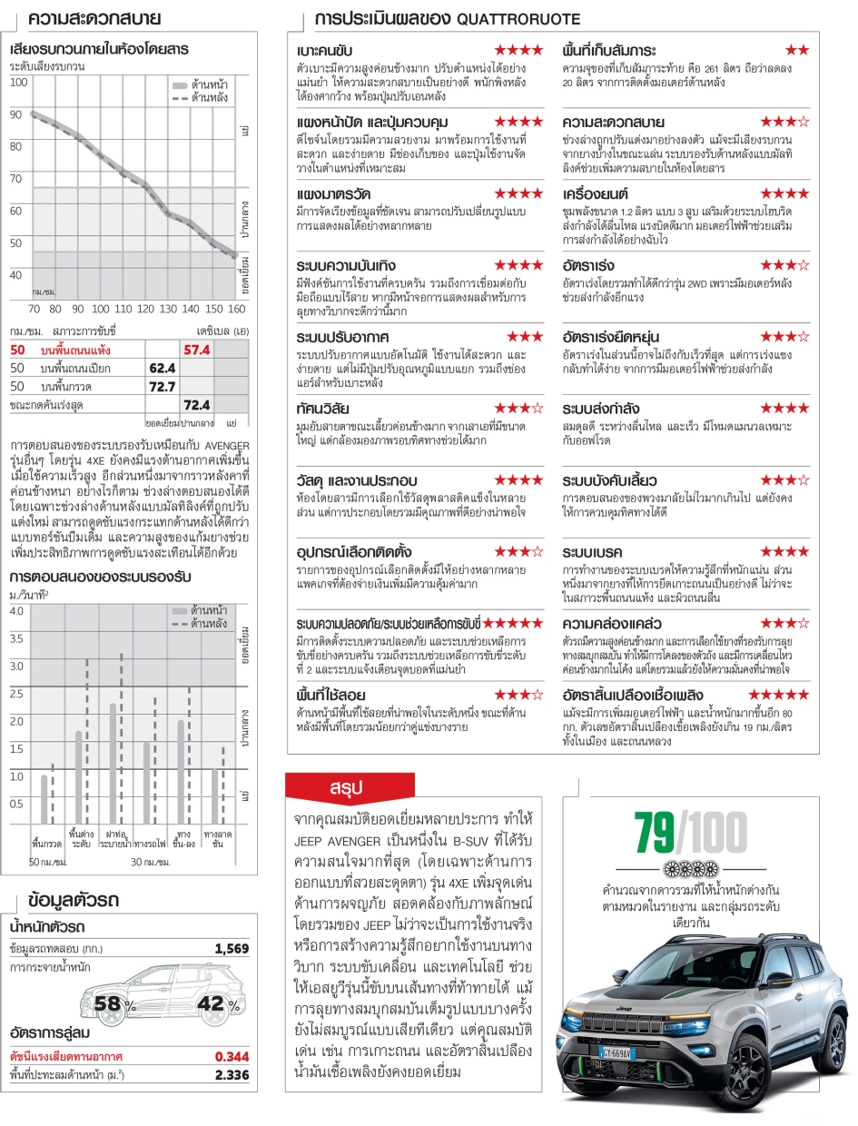จากคุณสมบัติยอดเยี่ยมหลายประการ ทำให้ JEEP AVENGER เป็นหนึ่งใน B-SUV ที่ได้รับความสนใจมากที่สุด (โดยเฉพาะด้านการออกแบบที่สวยสะดุดตา) รุ่น 4XE เพิ่มจุดเด่นด้านการผจญภัย สอดคล้องกับภาพลักษณ์โดยรวมของ JEEP ไม่ว่าจะเป็นการใช้งานจริง หรือการสร้างความรู้สึกอยากใช้งานบนทางวิบาก ระบบขับเคลื่อน และเทคโนโลยี ช่วยให้เอสยูวีรุ่นนี้ขับบนเส้นทางที่ท้าทายได้ แม้การลุยทางสมบุกสมบันเต็มรูปแบบบางครั้งยังไม่สมบูรณ์แบบเสียทีเดียว แต่คุณสมบัติเด่น เช่น การเกาะถนน และอัตราสิ้นเปลืองน้ำมันเชื้อเพลิงยังคงยอดเยี่ยม