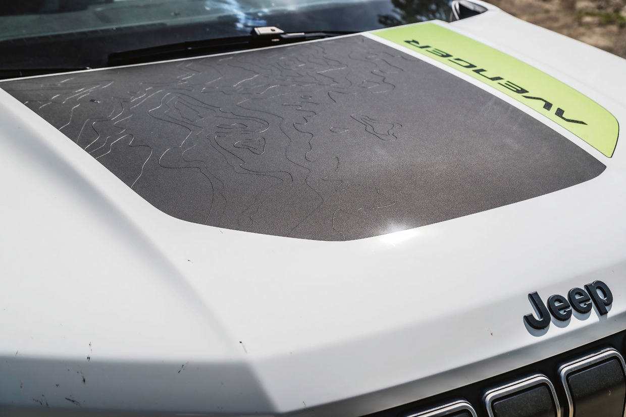 รถยนต์รุ่นนี้มีรายละเอียดหลายอย่างที่ทำให้ 4XE แตกต่างจาก AVENGER รุ่นอื่นๆ นอกเหนือจากราวหลังคา และล้อแมกสีดำขนาด 17 นิ้ว (ซึ่งมีดีไซจ์นเหมือนกับรุ่นย่อย ALTITUDE ของ AVENGER) พร้อมยางแบบ ALL-TERRAIN นอกจากนี้ยังมีกันชนหน้าหุ้มวัสดุป้องกันรอยขีดข่วน มีการออกแบบให้มีลักษณะยื่นออกมา และขยายความยาวเพิ่มขึ้น เพื่อปกป้องชุดเรดาร์ และเซนเซอร์ได้ดียิ่งขึ้น ขณะเดียวกันชุดไฟตัดหมอกก็ถูกยกตำแหน่งให้สูงขึ้นเล็กน้อย ในภาพด้านข้างจะเห็นแถบสีเขียวแนวตั้งที่ด้านล่างของชุดกระจังหน้า (อุปกรณ์แบบ MOPAR ราคา 64 ยูโร) และที่ภาพด้านขวาจะพบกับจุดเด่นที่ถูกซ่อนเอาไว้เพิ่มเติมจากสิ่งที่คุ้นเคยกันดีอยู่แล้ว นั่นคือ รูปเป็ดที่บ่งบอกระดับน้ำ กรณีต้องขับลุยน้ำ (สูงสุด 400 มม.) อีกหนึ่งออพชันเสริมจากโรงงาน คือ สติกเคอร์บนฝากระโปรงหน้า (ราคา 205 ยูโร) ที่ใช้สีดำด้านเพื่อลดการสะท้อนแสงเข้าสู่ห้องโดยสาร ส่วนด้านหลังมีหูลากจูงที่โผล่ออกมาให้เห็น ซึ่งติดตั้งมาพร้อมจากโรงงาน ไม่เพียงแต่เพิ่มเอกลักษณ์เฉพาะตัว แต่ยังใช้งานได้จริงในหลายสถานการณ์บนทางวิบาก