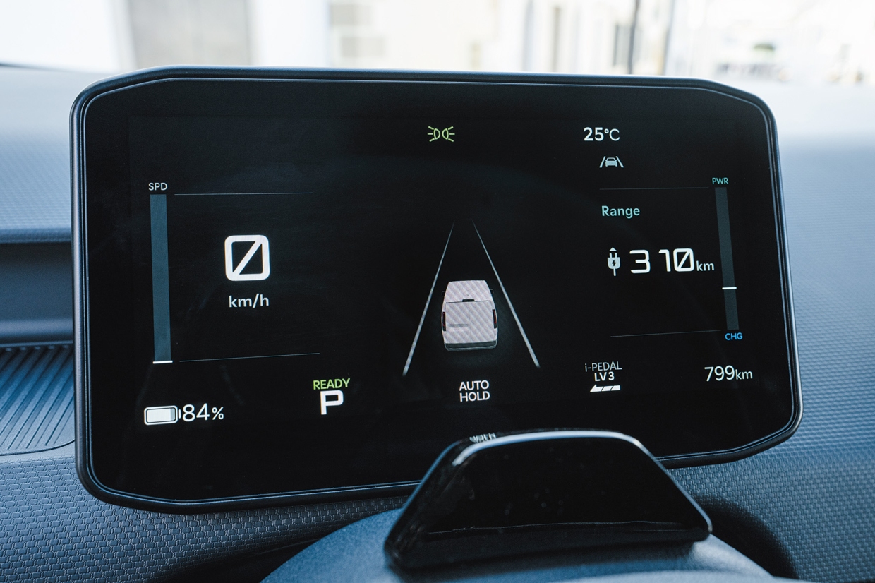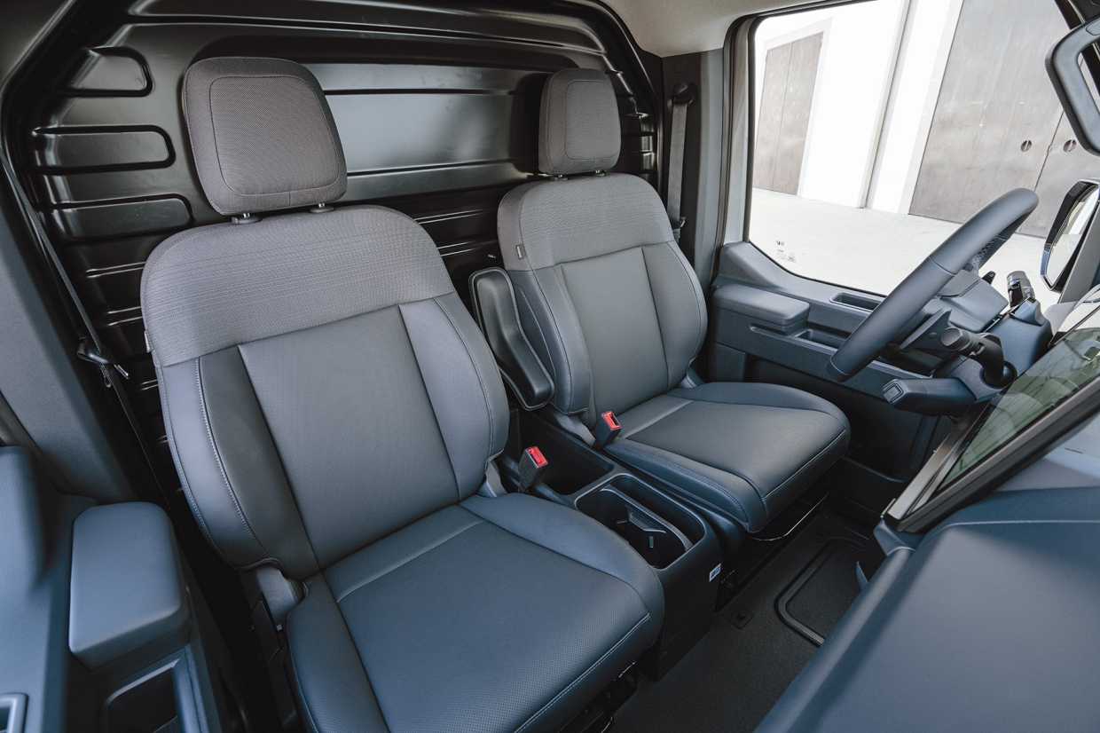 เมื่อพิจารณาภายในของตัวรถ ห้องโดยสารถูกขยับให้ไปข้างหน้า และสูงกว่ารถยนต์ขนาดใกล้เคียงกัน ให้ความรู้สึกโปร่งโล่งอย่างมาก ดังที่เราเคยกล่าวไว้แล้วในการทดลองขับเวอร์ชัน PASSENGER สำหรับการโดยสาร ตำแหน่งการขับอยู่ใกล้ส่วนหน้าของรถ ผู้ขับมองเห็นถนนผ่านกระจกหน้าบานใหญ่ได้อย่างชัดเจน เสริมความมั่นใจด้วยกระจกมองข้างที่มีขนาดใหญ่ตามแนวเส้นขอบตัวถังที่ต่ำ รถยนต์ไฟฟ้าที่ท้าทายรถตู้ขนาดกลางจากข้อจำกัดด้านล่างของตัวถังเช่นนี้ ต้องมีคุณสมบัติโดยรวมที่ผ่านมาตรฐาน ทั้งในแง่ความสมดุลระหว่างมิติตัวถัง ความจุโดยรวม และประสิทธิภาพการใช้งาน รวมถึงความสะดวกสบายในการขับขี่ เพราะรถประเภทนี้มักถูกใช้งานโดยผู้ขับที่ไม่คุ้นเคยกับการถ่ายเทน้ำหนักที่ชัดเจนของรถยนต์ไฟฟ้า และมีจุดศูนย์ถ่วงสูง