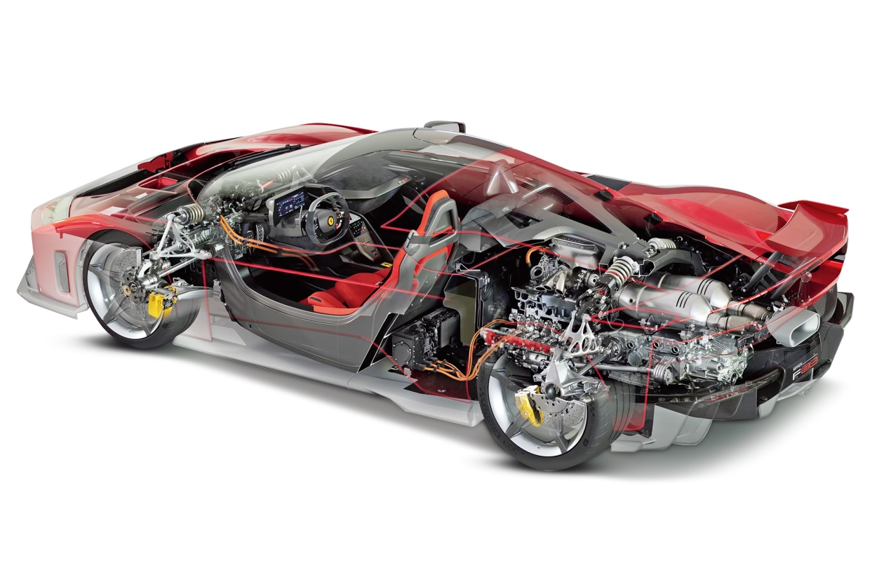 หากเครื่องยนต์ วี 12 สูบ แบบไม่มีระบบอัดอากาศของ FERRARI คือ สัญลักษณ์แห่งความเร้าใจ และสิ่งที่ถูกถ่ายทอดมายาวนาน ในปัจจุบันเครื่องยนต์ วี 6 สูบ เทอร์โบคู่ คือ แนวหน้ารุ่นใหม่ของสมรรถนะสูงสุด ไม่ใช่เรื่องบังเอิญที่โครงสร้างลักษณะเดียวกันนี้ถูกนำมาใช้ทั้งในรถแข่ง F1 และการแข่งขัน WEC ผลลัพธ์ คือ ขุมพลังที่มีความกะทัดรัด สามารถติดตั้งองค์ประกอบอื่นๆ ของระบบไฮบริด ซึ่งเป็นเทคโนโลยีที่ถูกใช้อย่างแพร่หลายในการแข่งรถระดับสูง อีกทั้งยังส่งผลดีต่อรูปทรงภายนอกของตัวรถ ช่วยยกระดับอากาศพลศาสตร์ และการกระจายน้ำหนักเพื่อให้ได้มีความสมดุลที่ดีที่สุดเท่าที่จะเป็นไปได้