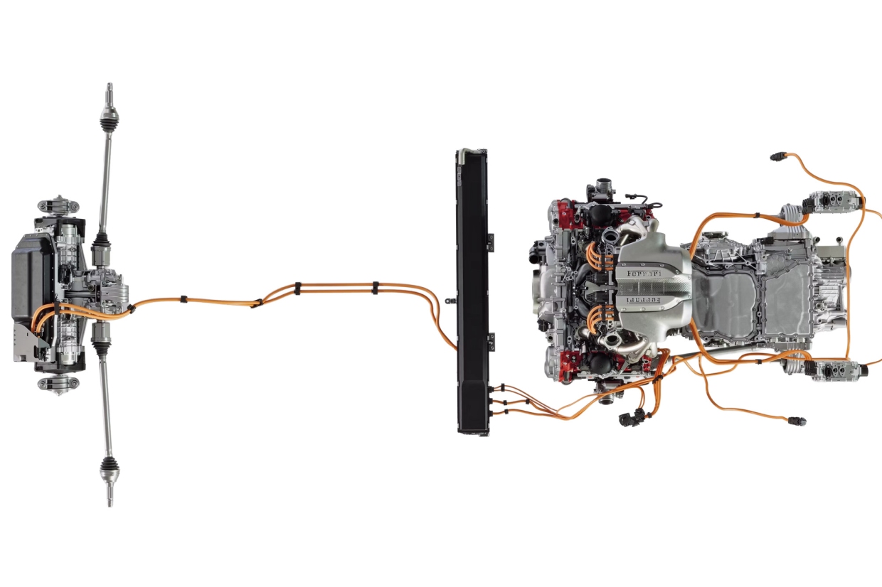 เคียงข้างเครื่องยนต์ วี 6 สูบ คือ ชุดมอเตอร์ไฟฟ้าแบบกระแสตรง ทำหน้าที่กู้คืนพลังงานไฟฟ้า สตาร์ทการเผาไหม้ และเสริมแรงขับ ขณะที่ด้านบนของเครื่องยนต์ทั้ง 2 ฝั่งของกระบอกสูบ เป็นที่ตั้งของเทอร์โบไฟฟ้าแรงดัน 48 โวลท์ จำนวน 2 ชุด ซึ่งถือเป็นครั้งแรกของค่ายม้าลำพอง สุดท้าย คือ เพลาหน้าของมอเตอร์ไฟฟ้ามีน้ำหนักเบา และประสิทธิภาพสูงกว่าของรุ่น SF90 STRADALE โดยยังคงใช้มอเตอร์แบบเพลาขับเดี่ยว 2 ชุด ทำหน้าที่สร้างระบบขับเคลื่อน 4 ล้อ และที่สำคัญยิ่งกว่า คือ การนำระบบควบคุมแรงบิดมาใช้ เพื่อยกระดับการควบคุม และการเข้าโค้งที่เฉียบคมยิ่งขึ้น