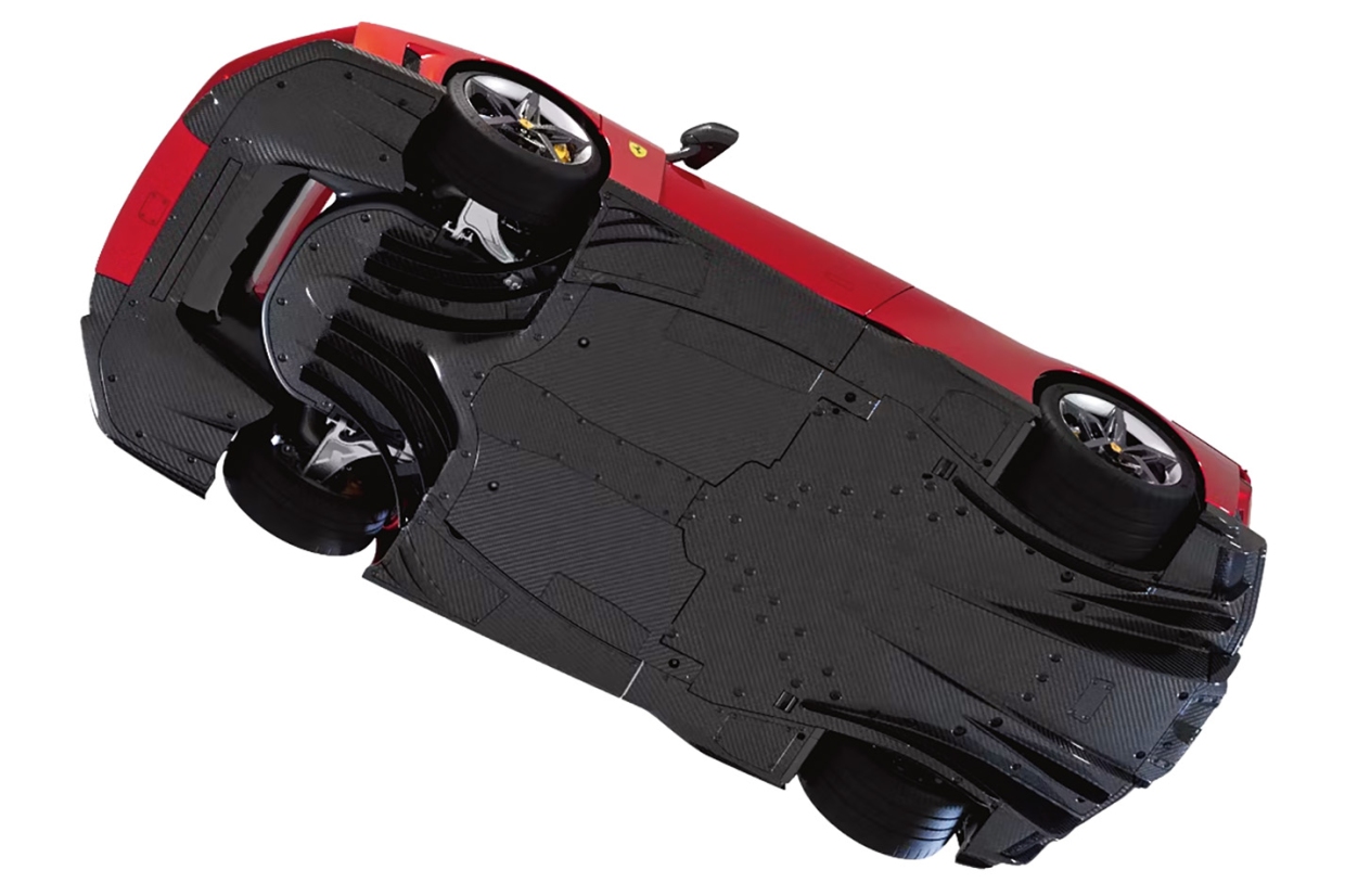 โครงสร้างตัวถังผลิตจากคาร์บอนไฟเบอร์ ขณะที่โครงสร้างบริเวณด้านหน้า และด้านหลัง (รวมถึงจุดยึดเครื่องยนต์ และแบทเตอรี) ทำจากวัสดุอลูมิเนียม ส่งผลให้ความแข็งแกร่งต่อการบิดตัวเพิ่มขึ้นถึง 50 % เมื่อเทียบกับรุ่น LAFERRARI การจัดวางห้องโดยสารเป็นแบบอสมมาตร โดยฝั่งผู้ขับมีความยาว และความกว้างมากกว่าฝั่งผู้โดยสาร ส่งผลให้ต้องเพิ่มจำนวนผนังโครงสร้าง และวัสดุดูดซับแรงบริเวณด้านซ้ายของตัวรถมากยิ่งขึ้น