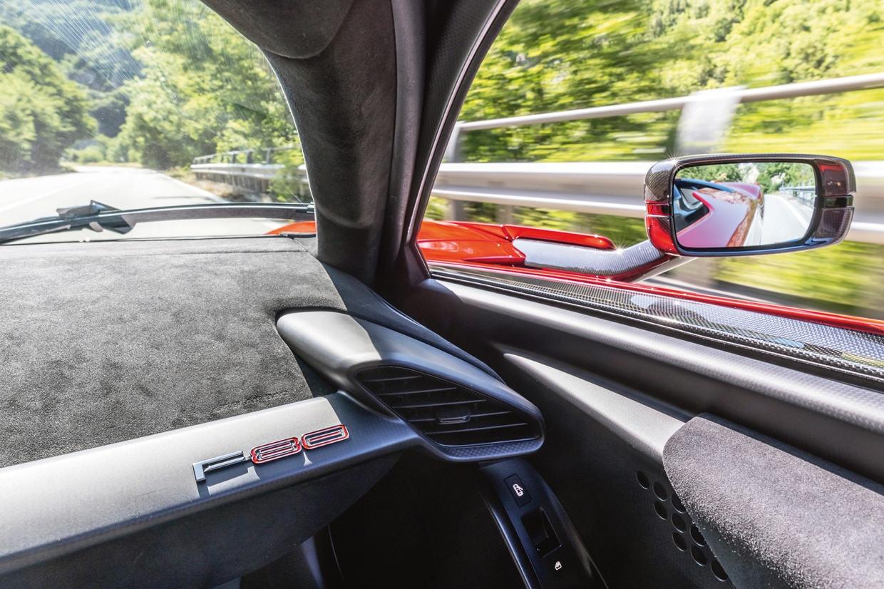 ในแง่ของความเร็ว คงไม่จำเป็นต้องอธิบายมากนัก ด้วยกำลังร่วม 900 แรงม้าจากเครื่องยนต์สันดาปเพียงอย่างเดียว (ขอย้ำว่าเครื่องยนต์แบบ วี 6 สูบ ความจุ 3.0 ลิตรที่ใช้เทอร์โบไฟฟ้านี้ให้กำลังสูงถึง 300 แรงม้า/ลิตร) และกำลังไฟฟ้าเพิ่มเติมอีก 300 แรงม้าเมื่อจำเป็น คันเร่งจึงต้องถูกใช้อย่างมีสติ และรอบคอบ เราไม่เคยต้องคุมคันเร่งอย่างละเอียดอ่อนเท่านี้มาก่อน F80 สร้างความเร็วระดับเหนือคำบรรยายในพื้นที่ที่สั้นอย่างเหลือเชื่อ และนี่คือ สิ่งที่ต้องตระหนักให้ดี เพราะคุณกำลังก้าวเข้าสู่อีกมิติหนึ่งที่เกินกว่ามาตรฐานเดิม