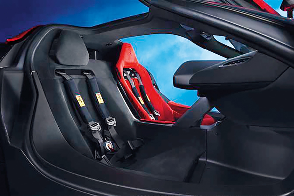 บานประตูถูกออกแบบให้มีบานพับติดกับหลังคา การเปิดออกเพื่อเข้าสู่ห้องโดยสารมีความเป็นเอกลักษณ์ ซึ่ง FERRARI ให้นิยามว่าเป็นรถสปอร์ท 2 ที่นั่ง ที่ให้ความรู้สึกคล้ายแบบ 1 ที่นั่ง ห้องโดยสารมีการจัดวางแบบอสมมาตร โดยพื้นที่ฝั่งผู้โดยสารถูกออกแบบให้สั้น และแคบกว่า (แต่ยังคงใช้งานได้เต็มที่ ซึ่งทีมงานของเราได้พิสูจน์มาแล้ว) ติดตั้งเบาะสีดำแบบยึดตายตัว ตัวเบาะรวมเป็นส่วนหนึ่งของตัวถัง และแทบมองไม่เห็นจากฝั่งผู้ขับ