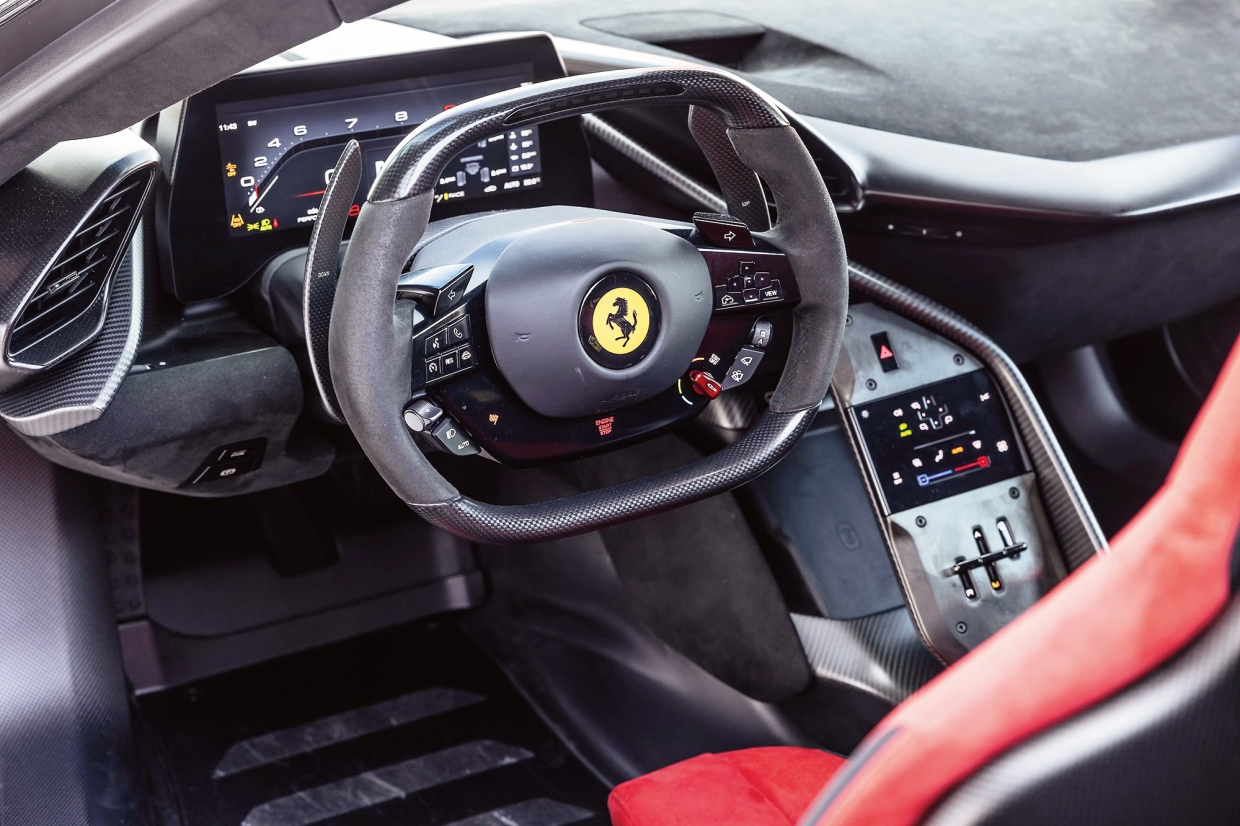 เมื่อเข้าไปในห้องโดยสาร เรารัดเข็มขัดนิรภัยแบบ 4 จุด ปรับตำแหน่งขับขี่ให้เหมาะสม เบาะนั่งติดตั้งในระดับความสูงคงที่ แต่สามารถปรับระยะลึก และมุมพนักพิงได้ แป้นเหยียบเป็นส่วนหนึ่งของโครงสร้างตัวถัง (ต่างจาก LAFERRARI) ขณะที่คอพวงมาลัยปรับได้สองแกน พร้อมการขยับตำแหน่งแผงหน้าปัดดิจิทอลเคลื่อนที่ไปด้วย พวงมาลัยขนาดเล็กดีไซจ์นเฉพาะจับถนัดมือ ส่วนก้านมีความโค้งมน ส่วนบน และล่างของพวงมาลัยตัดแบน ให้ความรู้สึกราวกับแผงควบคุมของรถแข่งอย่างแท้จริง