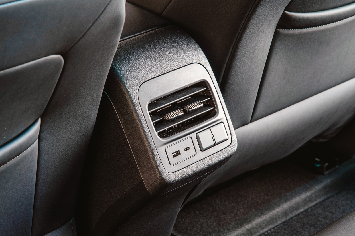 คอนโซลกลางโดดเด่นด้วยการออกแบบที่เชื่อมต่อกันอย่างซับซ้อน ส่วนบนเป็นช่องเก็บของเน้นความลึก มีระบบควบคุมอุณหภูมิในตัว ด้านล่างมีชั้นวางของชิ้นเล็ก การใช้งานช่องต่อ USB ไม่สะดวกสำหรับผู้โดยสาร (มีหนึ่งช่องแบบ TYPE A และอีกหนึ่งช่องแบบ TYPE C) ขณะที่ผู้ขับเอื้อมถึงช่องเสียบไฟแบบ 12 โวลท์ที่อยู่อีกฝั่งได้ค่อนข้างลำบาก บริเวณกึ่งกลางมีสวิทช์สำหรับถุงลมนิรภัยของผู้โดยสารข้างผู้ขับ