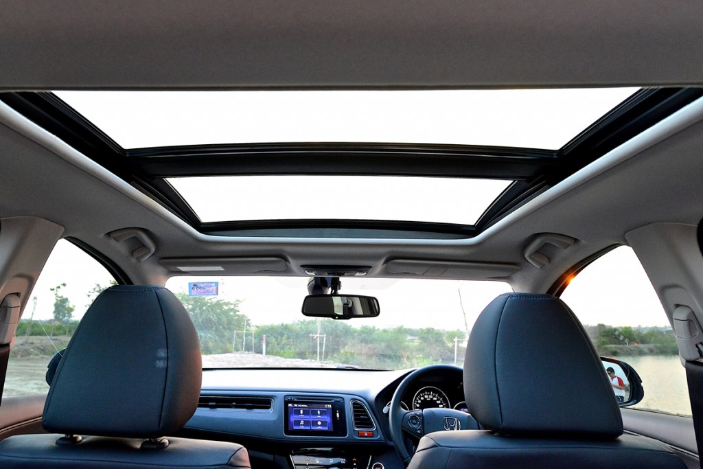 รุ่นที่เรานำมาทดสอบ เป็น เอชอาร์-วี ตัวทอพ รุ่น อีแอล การตกแต่งห้องโดยสารถือว่าจัดเต็ม เกินหน้ารุ่นพี่ราคานับล้านบาทขึ้นไปด้วยซ้ำ (ราคาของรุ่น อีแอล อยู่ที่ 1,045,000 บาท) ไม่ว่าจะเป็นการตกแต่งแผงข้างประตูด้วยหนังสังเคราะห์ และเบาะนั่ง รวมถึงพวงมาลัยหุ้มด้วยหนังแท้ หน้าจอระบบสัมผัสขนาด 7 นิ้ว น่าเสียดายที่ไม่มีระบบเครื่องเล่นดีวีดี และเนวิเกเตอร์มาให้ แต่ชดเชยเล็กน้อยด้วยการรองรับไฟล์ความบันเทิงความละเอียดสูง (HDMI) รวมไปถึงหลังคาซันรูฟทรงยาว แบบพาโนรามิค ยังมีติดตั้งมาให้ (จะมีเทียบได้ คือ ฟอร์ด อีโคสปอร์ท รุ่นทอพ ไททาเนียม ติดตั้งซันรูฟมาให้) ในแง่ของความครบครันด้านการใช้งาน เอชอาร์-วี นั้นถือว่าเกินหน้าเกินดาด้วยซ้ำ นับเป็นข้อดีที่น่าสนใจ