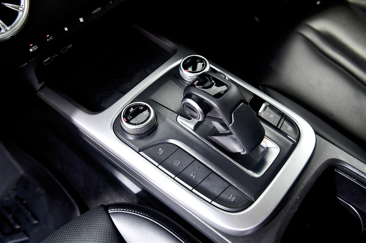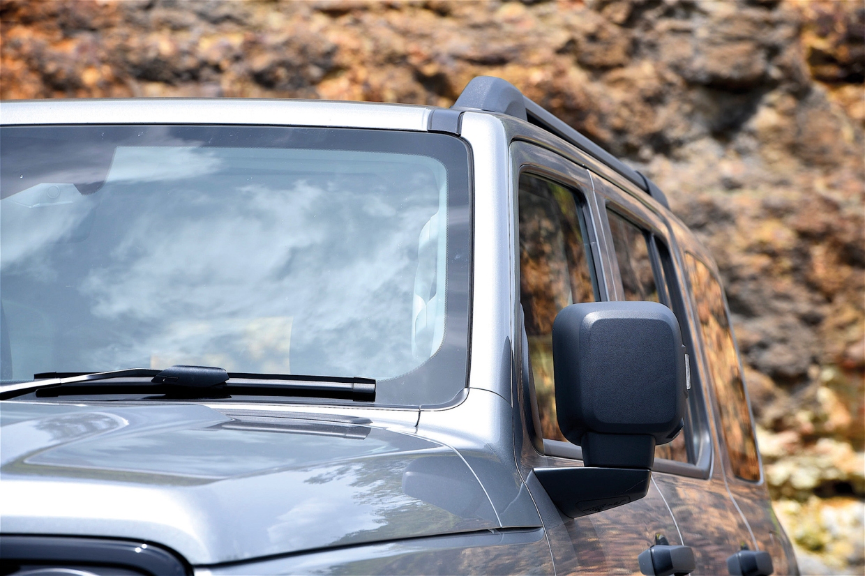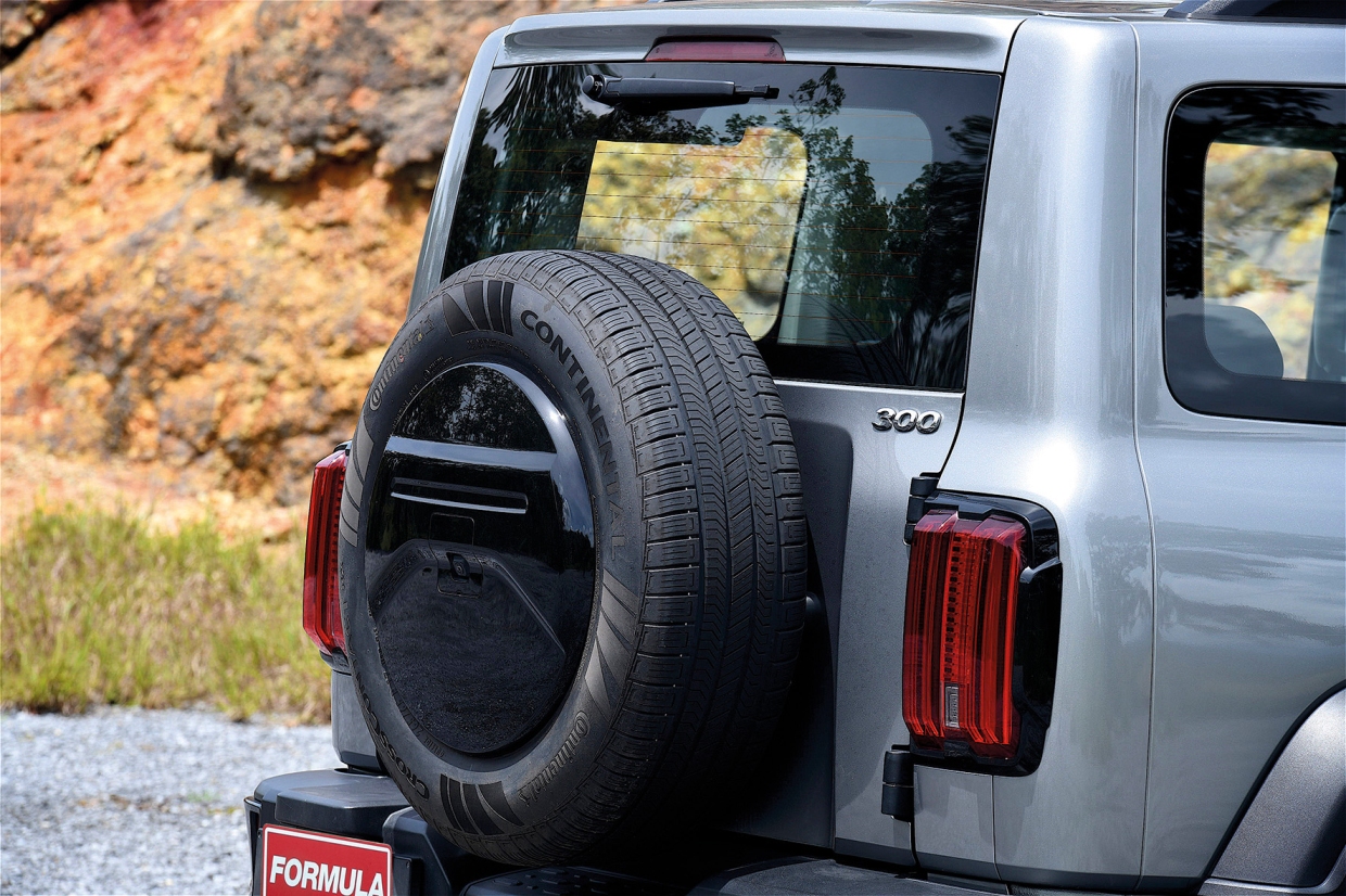 หนึ่งในสิ่งที่ขาดไม่ได้สำหรับเอสยูวียุคดั้งเดิม คือ การมียางอะไหล่ติดตั้งด้านนอกบริเวณประตูบานท้าย (เราคิดว่าน่าจะมีฝาครอบยางสักนิด แม้จะสามารถหาซื้อเพิ่มเติมได้ไม่ยาก) ประตูบานท้ายแบบเปิดออกด้านข้างไปทางขวา (เหมาะกับบ้านเราที่มักจะจอดรถฝั่งซ้ายมือ) บานประตูมีความแข็งแรง ชอคอับไฮดรอลิคของประตูมีขนาดใหญ่ สามารถหมุนเพื่อลอคตำแหน่งได้ หากจอดในที่ลาดเอียง เราพบว่าประตูสามารถปิดได้ไม่ยากเย็น ไม่ต้องออกแรงมากเกินไป ขณะที่ล้อแมกมีขนาด 17 นิ้ว ยางของ CONTINENTAL CROSS CONTACT (คอนทิเนนทัล ครอสส์ คอนแทคท์) ขนาด 255/45 R17 ดอกยางค่อนข้างละเอียด คาดว่ายังคงเป็นยางที่เน้นการใช้งานทางเรียบ ผสมการลุยได้ดีในระดับหนึ่ง (ใครที่ชอบการลุยหนักๆ อาจต้องหันมาใช้ยางแบบ ALL TERRAIN แทน)