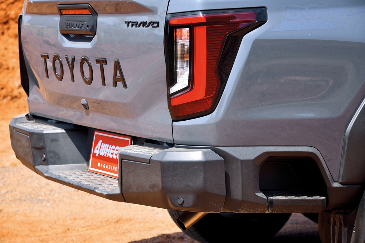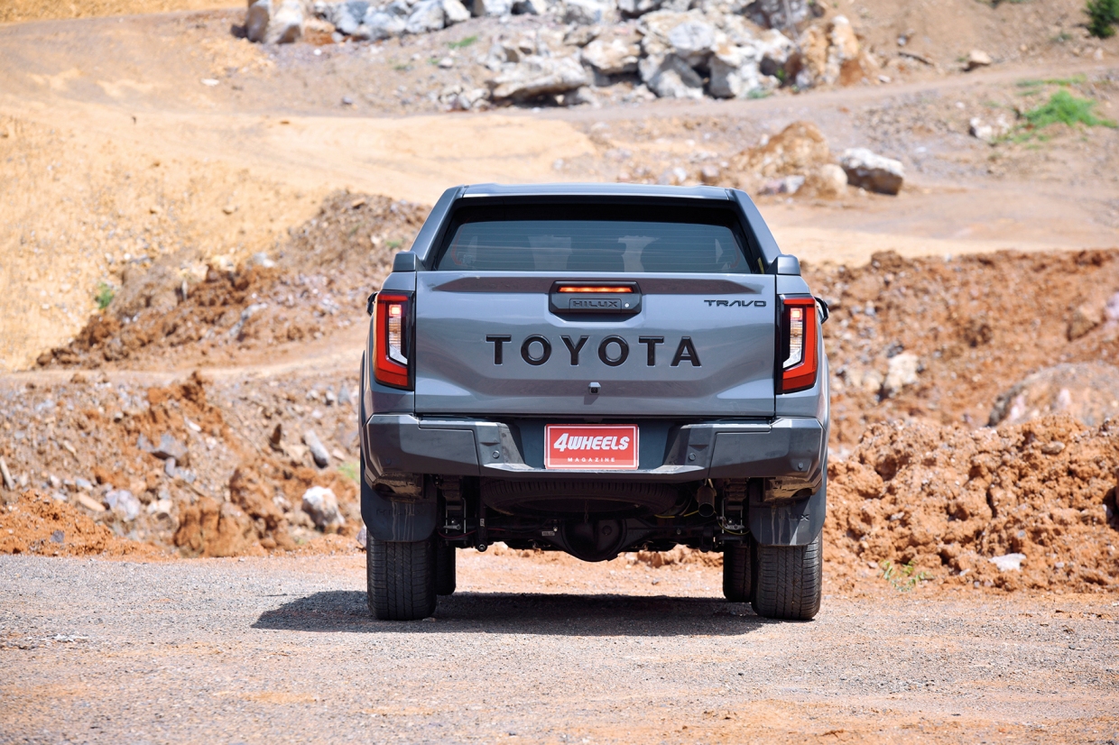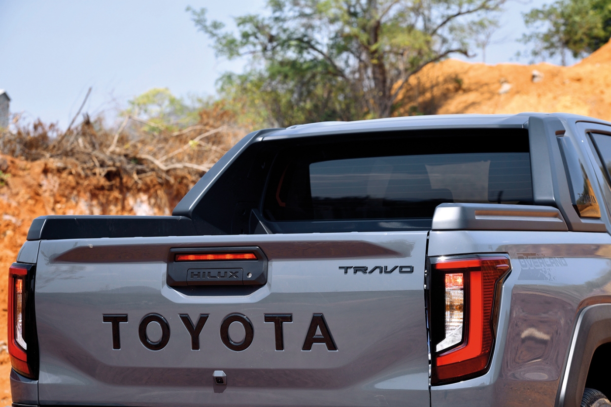 ด้านหลัง TRAVO OVERLAND ยังคงทำให้นึกถึง REVO ROCCO ด้วยสปอร์ทบาร์สีดำติดเสริมความแกร่งบนท้ายกระบะ แต่ที่ดูแตกต่างออกไป ก็เป็นตัวกระบะท้ายที่มีเส้นสายกับกันชนท้ายที่ต่างกัน และไฟท้าย LED ดีไซจ์นใหม่ ตัวอักษร TOYOTA และ TRAVO สีดำ ที่ดูแปลกตา เปลี่ยนจากตัว “E” และ “3” มาเป็น “T” และ “J”